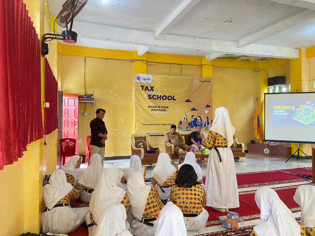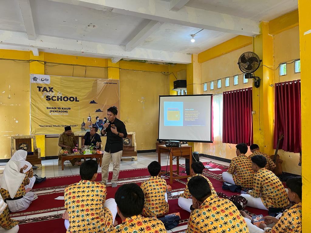 Kantor Pelayanan, Penyuluhan, dan Konsultasi Perpajakan (KP2KP) Bintuhan menyelenggarakan agenda rutin tahunan Direktorat Jenderal Pajak (DJP), Tax Goes To School, dalam rangka mengenalkan peran pajak dan menumbuhkan kesadaran pajak sejak dini kepada para pelajar (Selasa, 15/8). Bertempat di Aula Graha Bintang Kaur, Desa Gedung Sako II, Kecamatan Kaur Selatan, Kabupaten Kaur, Provinsi Bengkulu, kegiatan Tax Goes To School ini diikuti oleh 31 siswa/i perwakilan Sekolah Menengah Atas (SMA) Negeri 10 Kaur Pentagon.