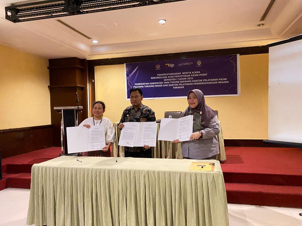 Kegiatan ini ditutup dengan penandatanganan Berita Acara (BA) Rekonsiliasi atas Penyetoran Pajak Pusat Semester 1 (satu) tahun 2023 oleh Plh. Kepala BPKAD Tana Tidung Surianto, Plh. Kepala KPP Pratama Tanjung Redeb Asih Lestari, dan Plh. Kepala Kantor Pelayanan Perbedaharaan Negara (KPPN) Tarakan Yuni Yunarlis.