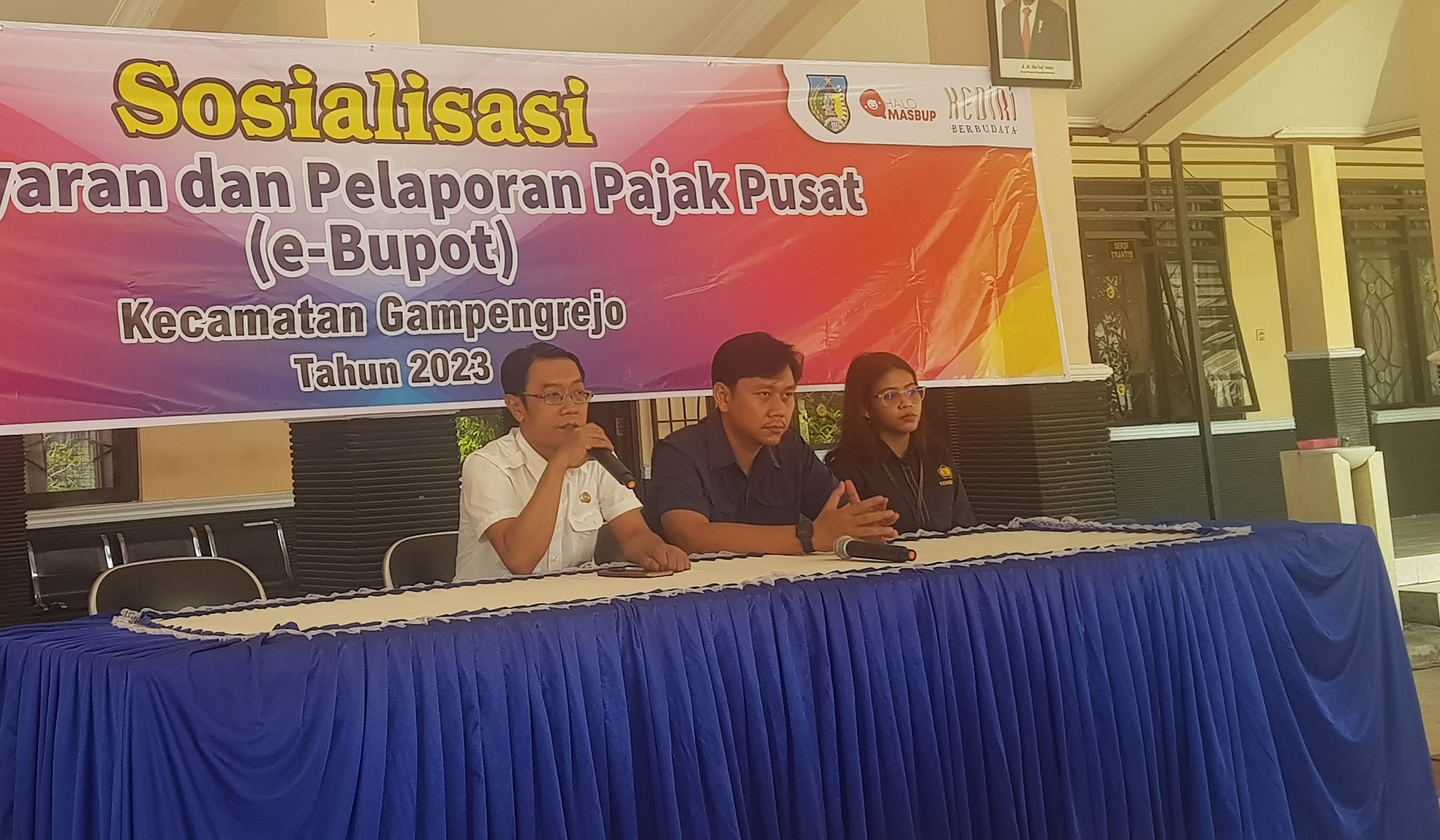 Sosialisasi ini bertujuan untuk memberikan penyuluhan terkait aplikasi e-Bupot unifikasi kepada Bendahara Kecamatan Gampengrejo yang kesulitan dalam menggunakan aplikasi. Kegiatan ini dimulai dengan menyanyikan lagu Indonesia Raya dilanjutkan dengan pembukaan kegiatan oleh Sekertaris Camat Kecamatan Gampengrejo Hario Kuncoro Yekti.