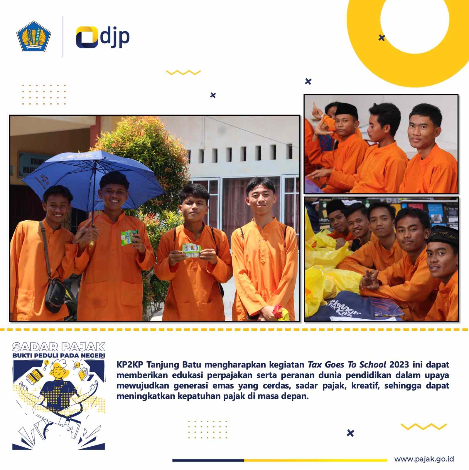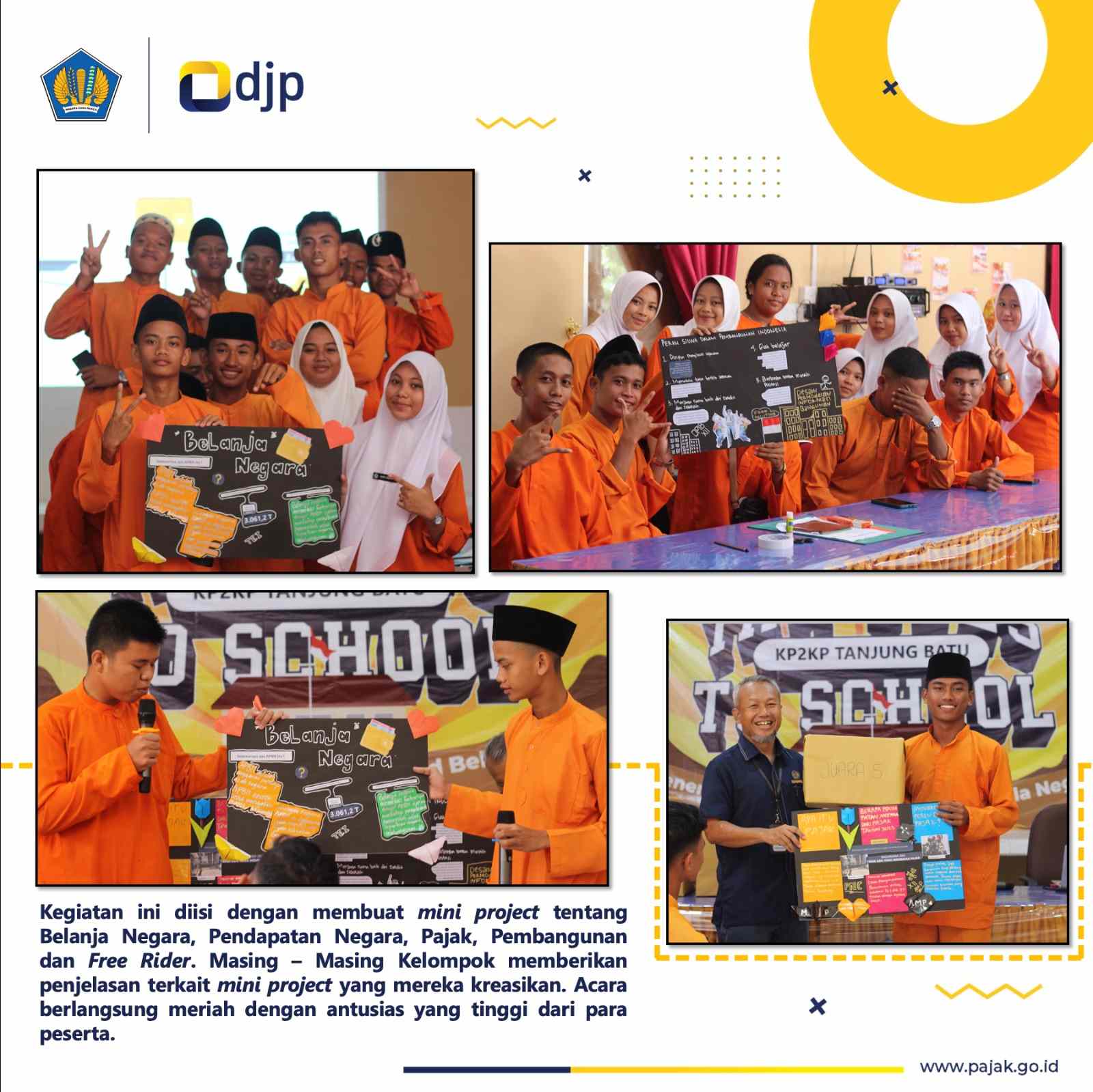 Kantor Pelayanan, Penyuluhan dan Konsultasi Perpajakan (KP2KP) Tanjung Batu menyelenggarakan kegiatan Tax Goes To School (TGTS) tahun 2023 bertempat di Aula Sekolah Menengah Kejuruan (SMK) Negeri Kundur, Kecamatan Kundur, Kabupaten Karimun, Kepulauan Riau (Jumat, 10/11). Acara edukasi dikemas dalam bentuk mini project dan kuis interaktif yang diikuti oleh seluruh peserta.