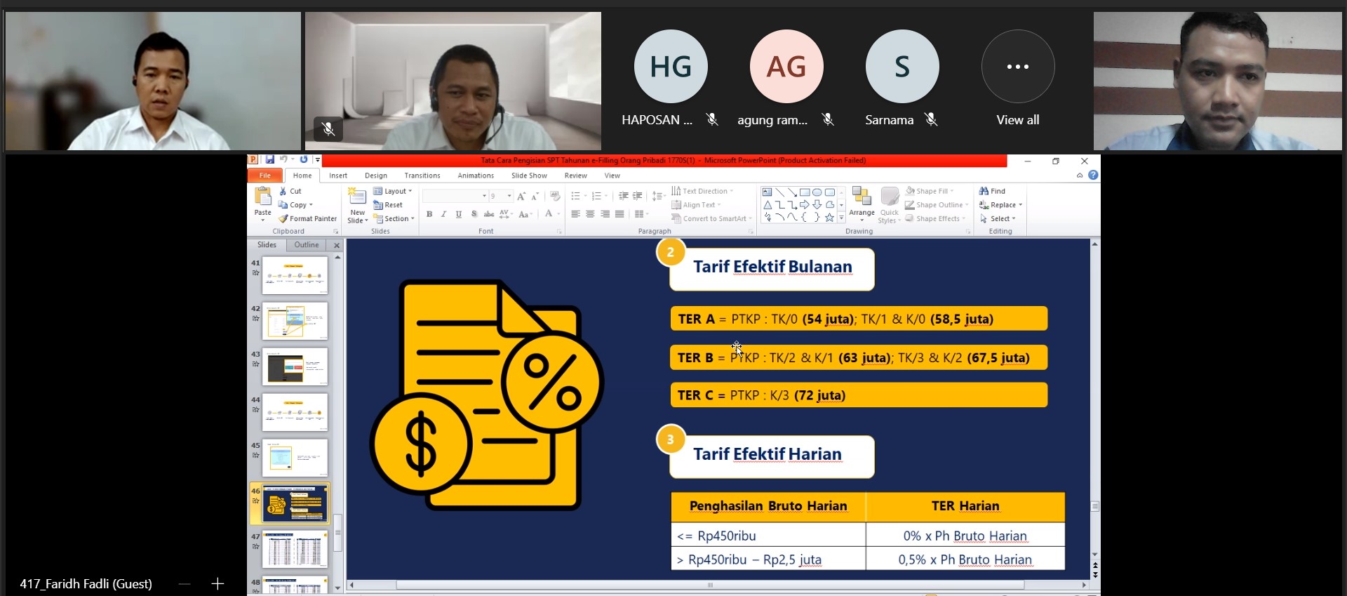 Kegiatan ditutup dengan sesi tanya jawab dengan peserta secara langsung maupun kolom chat dan sesi foto bersama. Dengan adanya kelas pajak ini dapat meningkatkan tingkat kepatuhan wajib pajak dan memberi wawasan pengetahuan tentang kewajiban perpajakan dengan melakukan pelaporan SPT Tahunan secara benar dan tepat kepada karyawan PT Lautan Otsuka Chemical.