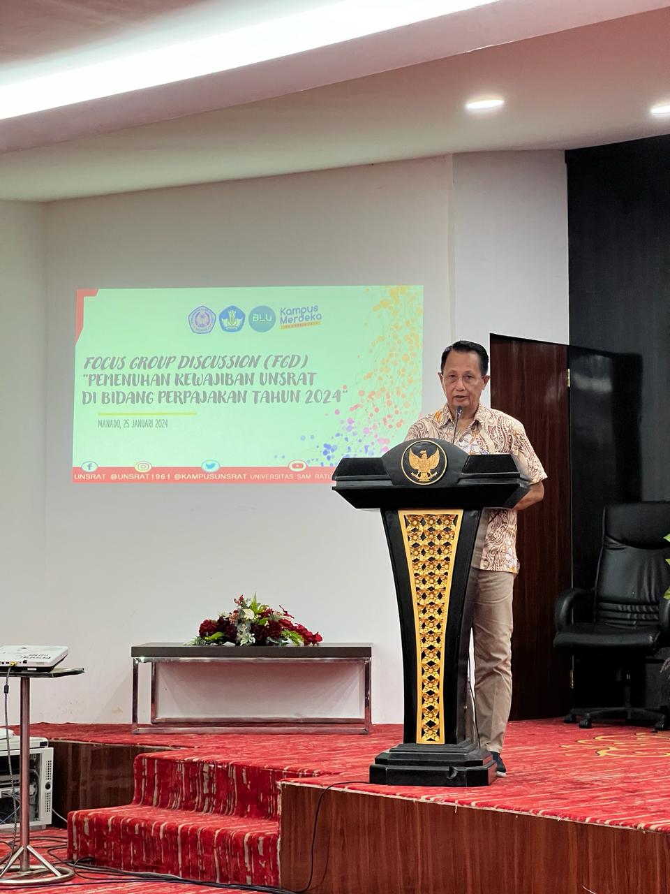 Kantor Pelayanan Pajak (KPP) Pratama Manado menghadiri undangan Forum Group Discussion (FGD) yang diadakan oleh Universitas Sam Ratulangi (Unsrat) di Ruang Rapat Kantor Pusat Unsrat, Sulawesi Utara (Kamis, 25/1). Acara ini dihadiri oleh kurang lebih seratus peserta yang di antaranya terdiri dari dekan, ketua lembaga, sekretariat, kepala Unit Pelaksana Teknis (UPT), sekretariat lembaga, tim pengelola dan remunerasi, Pejabat Penatausahaan Keuangan (PPK), bendahara pengeluaran ,serta bendahara penerimaan unit kerja.