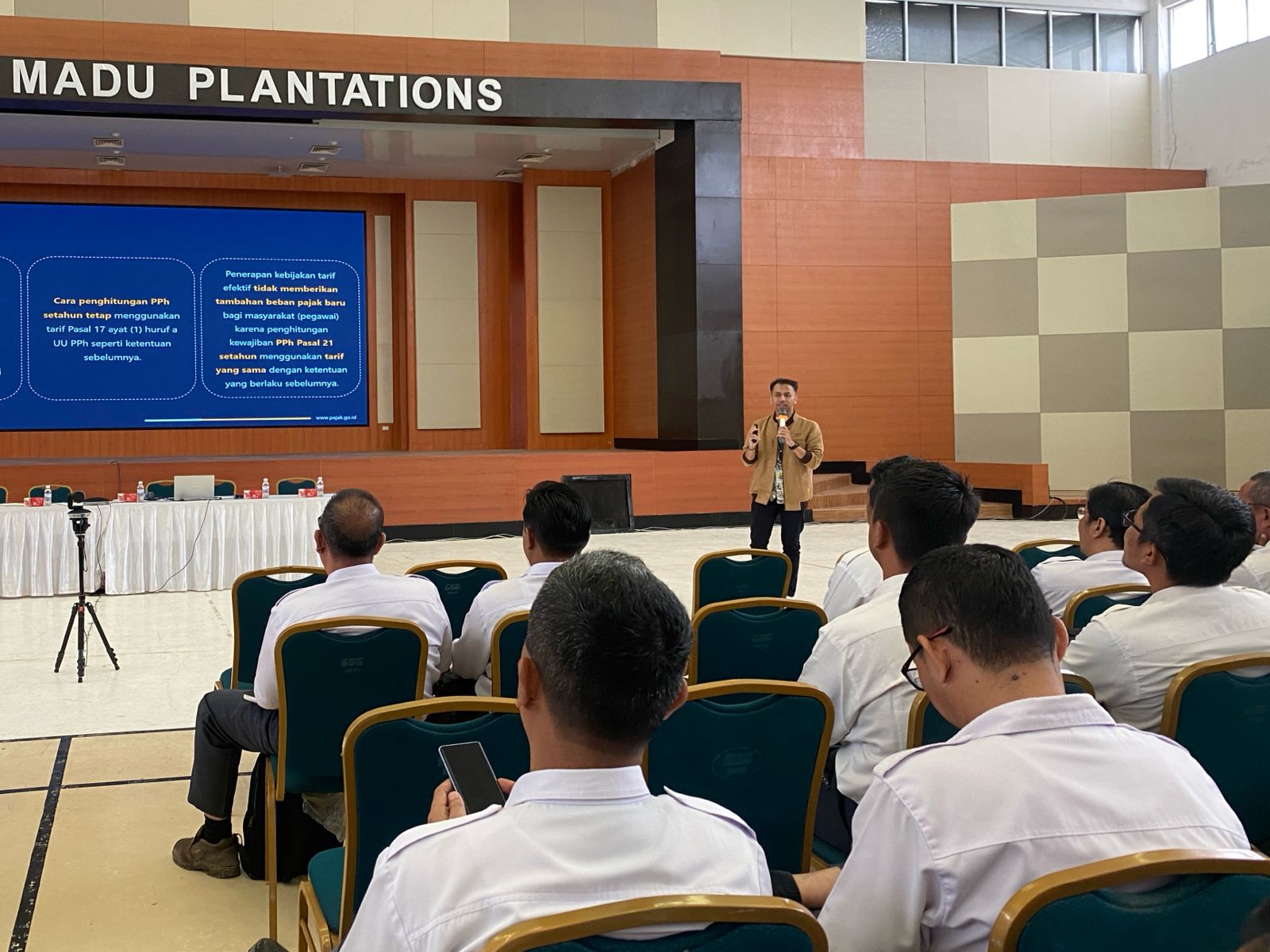 Kantor Pelayanan Pajak (KPP) Pratama Metro bersama Kantor Pelayanan, Penyuluhan, dan Konsultasi Perpajakan (KP2KP) Bandarjaya mendatangi Perseroan Terbatas (PT) Gunung Madu Plantations (GMP) untuk melaksanakan kegiatan sosialisasi pengenalan Tarif Efektif Rata-Rata (TER) Pajak Penghasilan (PPh) Pasal 21 yang bertempat di Gedung Aula PT GMP, Jalan Lintas Sumatra Nomor 31, Gunung Batin Udik, Terusan Nunyai, Lampung Tengah, Provinsi Lampung (Jumat, 8/3).