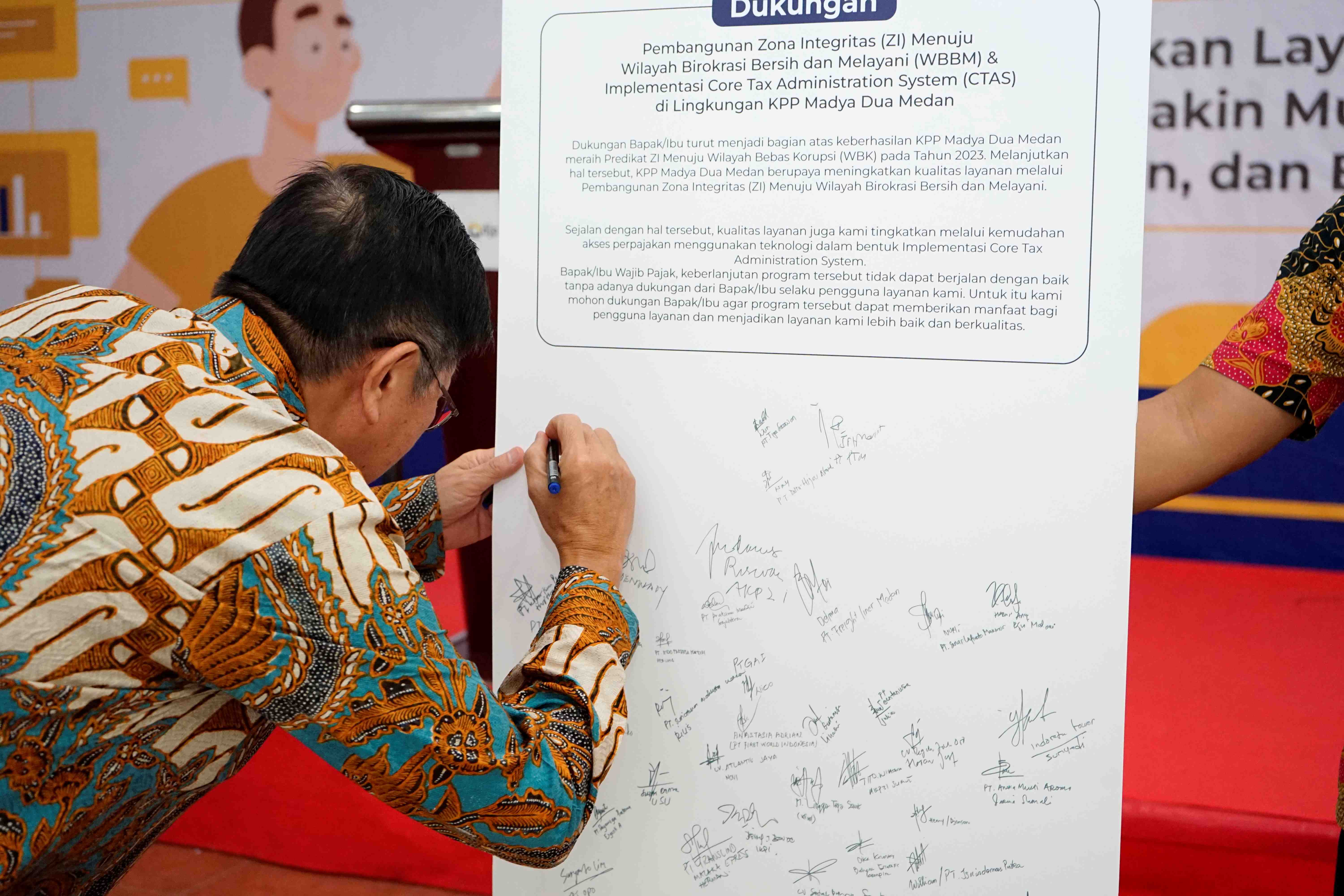 Acara ditutup pemberian dukungan dan penandatanganan piagam dukungan pembangunan ZI menuju WBBM dan implementasi CTAS oleh Wajib Pajak/stakeholder yang diwakili PDAM Tirtanadi, Universitas Sumatera Utara, Ketua IKPI Cabang Kota Medan (Drs. Barry Kusuma) dan Ketua AKP2I Kota Medan (Saragi Tua Simarmata).