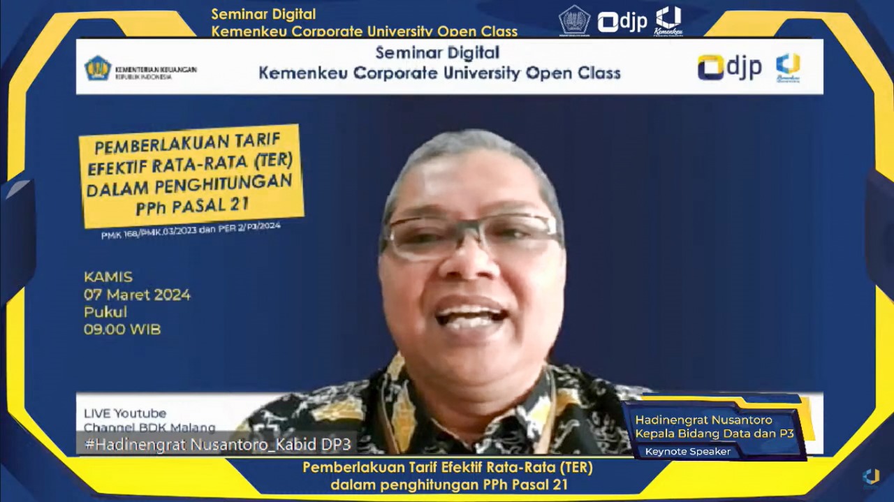 Kanwil DJP Jatim III bersama dengan BDK Malang @bdkmalang membahas peraturan terbaru di bidang perpajakan dalam webinar bertema pemberlakuan tarif efektif rata-rata (TER) dalam penghitungan PPh Pasal 21 dan implementasi Coretax . Kegiatan tersebut diselenggarakan secara daring melalui Zoom Meetings, serta diikuti oleh 507 peserta yang mayoritas merupakan pemotong pajak pada instansi pemerintah atau swasta, akademisi, serta mahasiswa, yang tersebar di seluruh wilayah Indonesia.