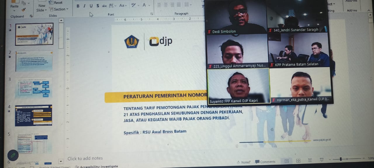 Kantor Wilayah Direktorat Jenderal Pajak Kepulauan Riau (Kanwil DJP Kepri) bersama dengan Kantor Pelayanan Pajak (KPP) Pratama Batam Selatan melakukan sosialisasi secara daring tentang Peraturan Pemerintah (PP) Nomor 58 Tahun 2023 dan Peraturan Menteri Keuangan (PMK) Nomor 168 Tahun 2023 kepada staf keuangan dan para dokter Rumah Sakit (RS) Awal Bross Grup dari ruang virtual Kanwil DJP Kepri, Kota Batam (Rabu, 13/3).