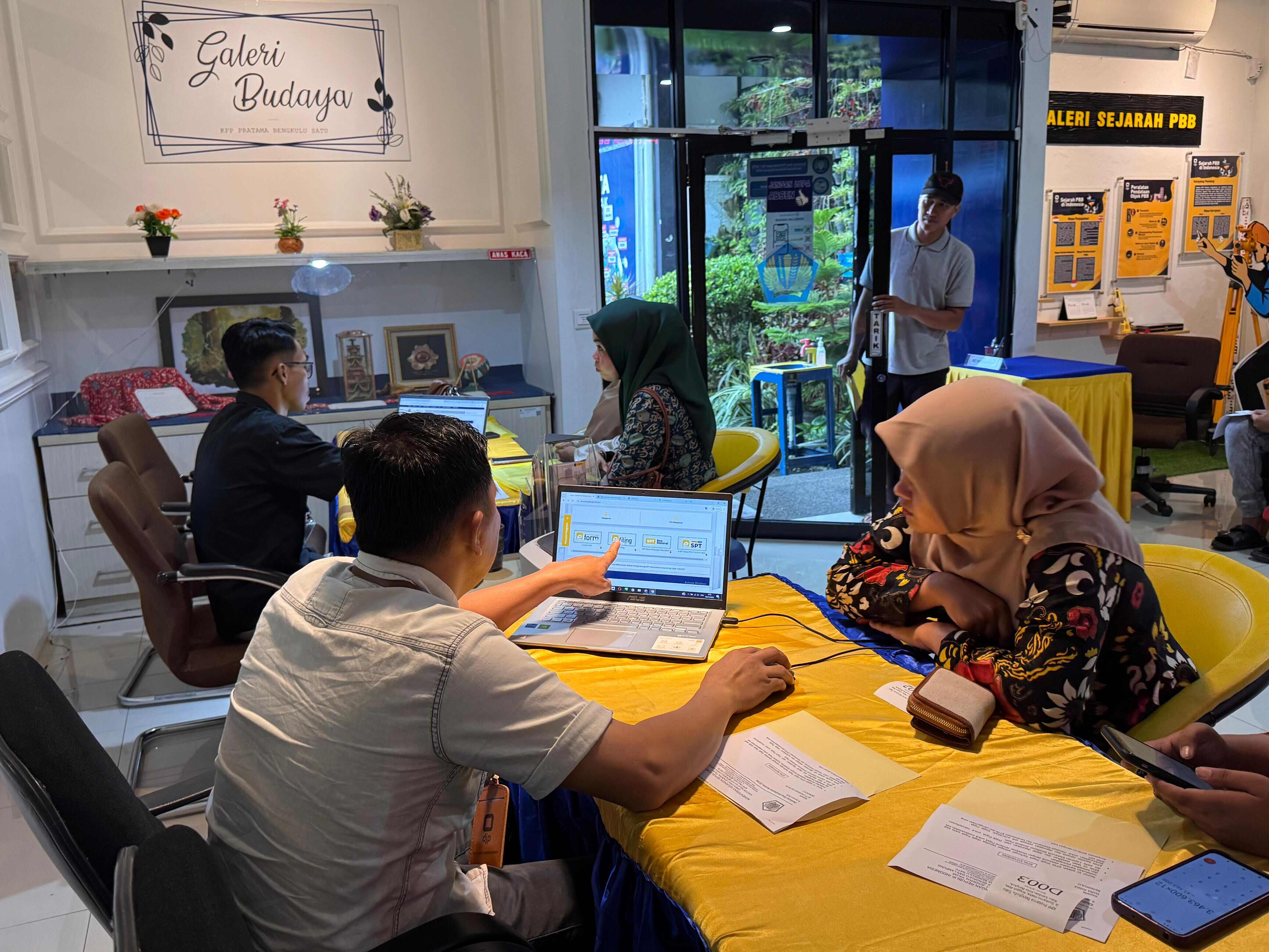 Terdapat 45 orang wajib pajak yang mengantre untuk mendapat asistensi lapor SPT Tahunan. Sementara itu, ada 30-an wajib pajak yang dilayani melalui meja helpdesk di Tempat Pelayanan Terpadu. Empat petugas KPP Pratama Bengkulu Satu melayani para wajib pajak untuk memastikan proses pelaporan SPT berjalan lancar.