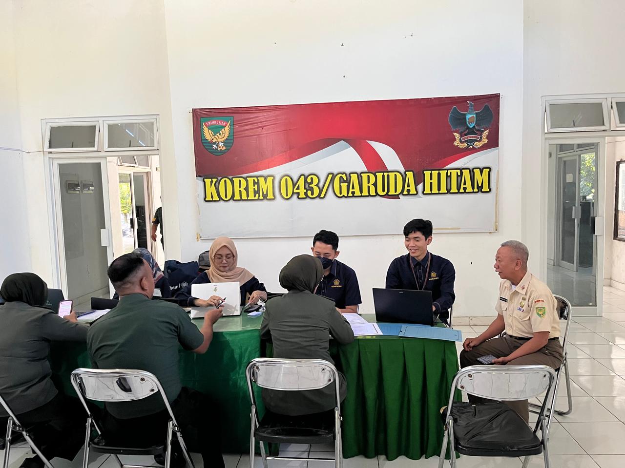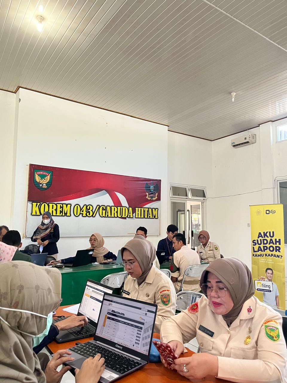 Petugas Kantor Pelayanan Pajak (KPP) Pratama Bandar Lampung Dua menginisiasi asistensi pelaporan Surat Pemberitahuan (SPT) Tahunan 2024 bagi anggota Tentara Nasional Indonesia (TNI) dan Aparatur Sipil Negara (ASN) di Komando Resor Militer (Korem) Garuda Hitam Lampung.