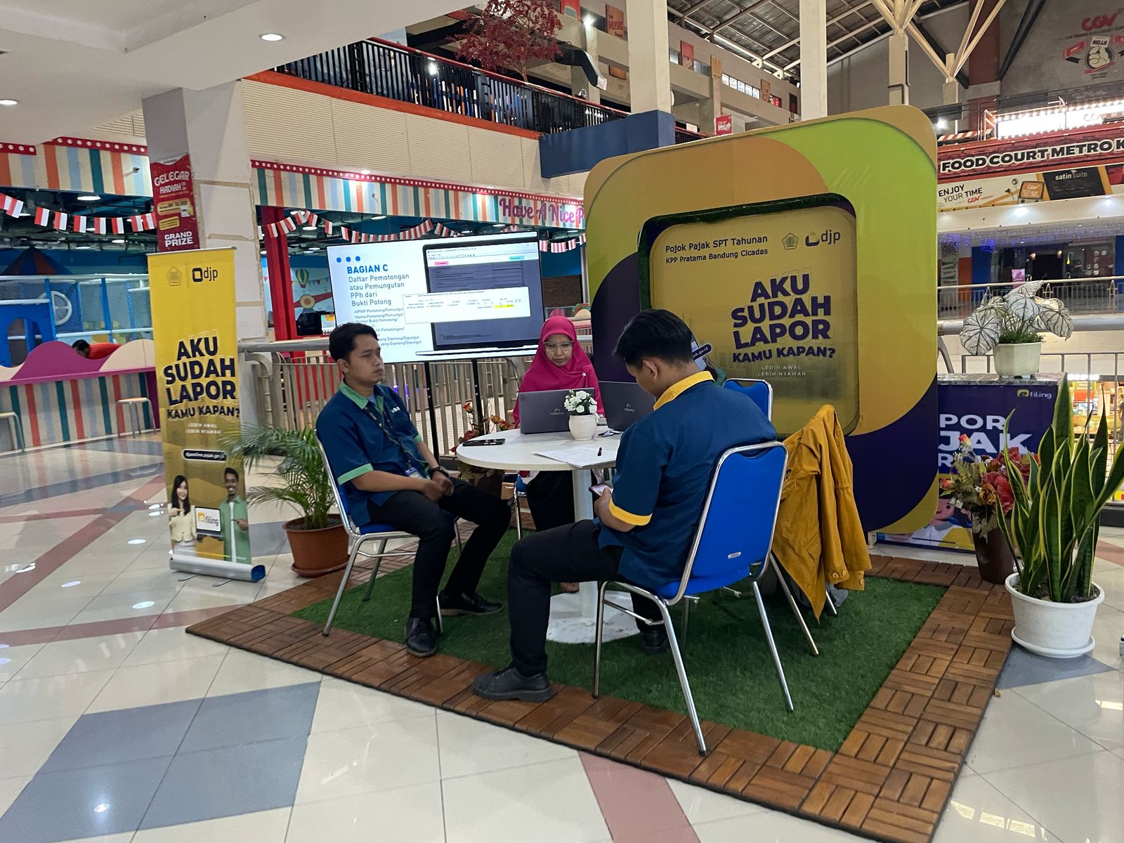 Kantor Pelayanan Pajak (KPP) Pratama Bandung Cicadas membuka layanan Pojok Pajak melayani wajib pajak yang berkonsultasi terkait pelaporan Surat Pemberitahuan (SPT) Tahunan Orang Pribadi di Metro Indah Mall (MIM) Bandung, Kota Badnung (Jumat, 28/2).