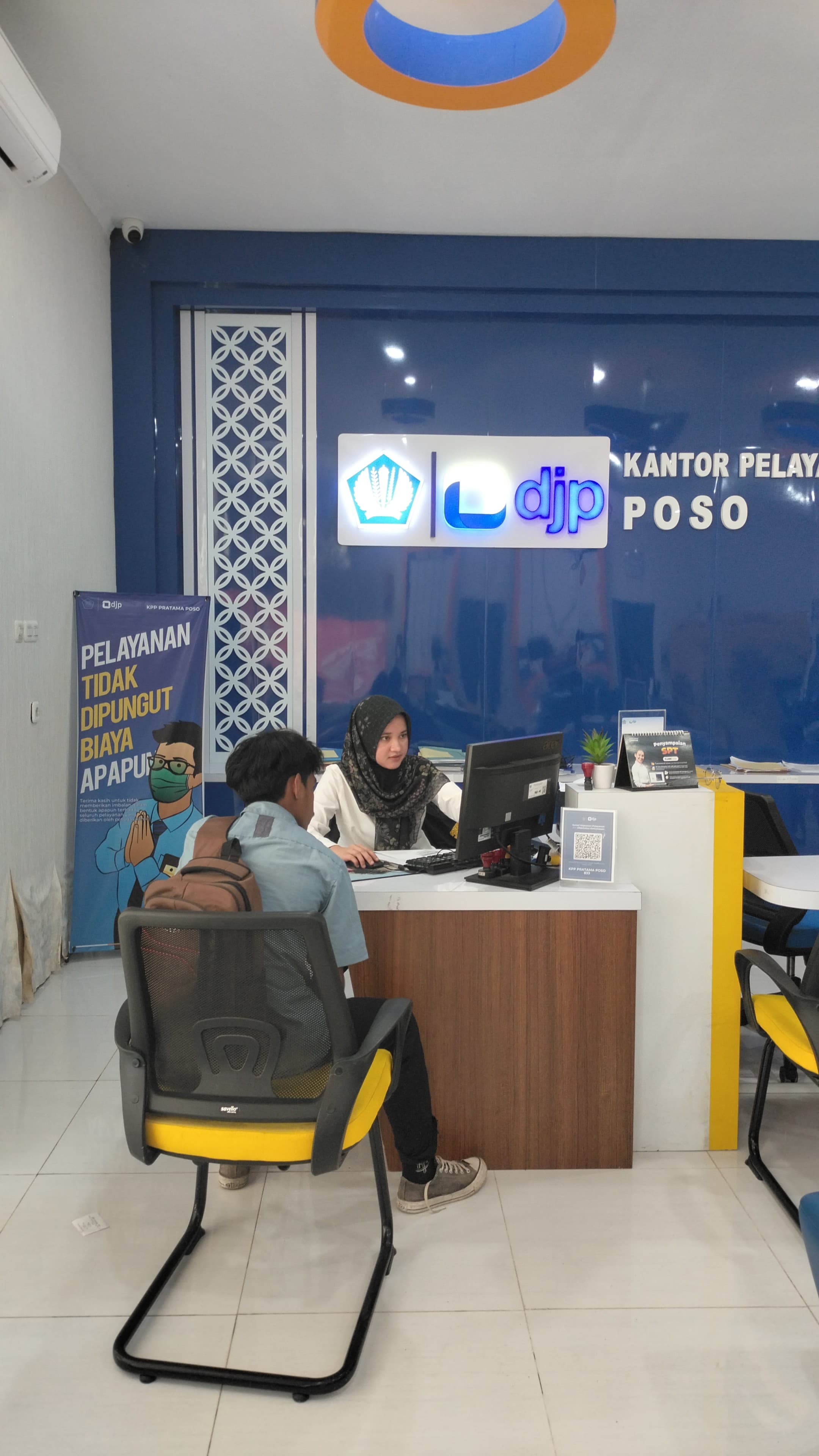 Dua orang wajib pajak, Fiki dan Selvi, mendatangi Kantor Pelayanan Pajak (KPP) Pratama Poso untuk mendapatkan pelayanan langsung dari petugas pajak dalam rangka pendaftaran Nomor Pokok Wajib Pajak (NPWP) di Bente, Kabupaten Morowali, Sulawesi Tengah (Senin, 21/4).