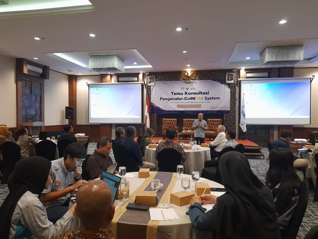 Kolaborasi Kantor Wilayah (Kanwil) Direktorat Jenderal Pajak (DJP) Jawa Tengah I dengan Kantor Pelayanan Pajak (KPP) Pratama Semarang Barat, dan KPP Pratama Semarang Candisari dalam kegiatan Temu Konsultasi Coretax kepada anggota Asosiasi Pengusaha Indonesia (Apindo) se-Kota Semarang di Petra Ballroom Hotel Noormans, Kota Semarang (Rabu, 21/5).
