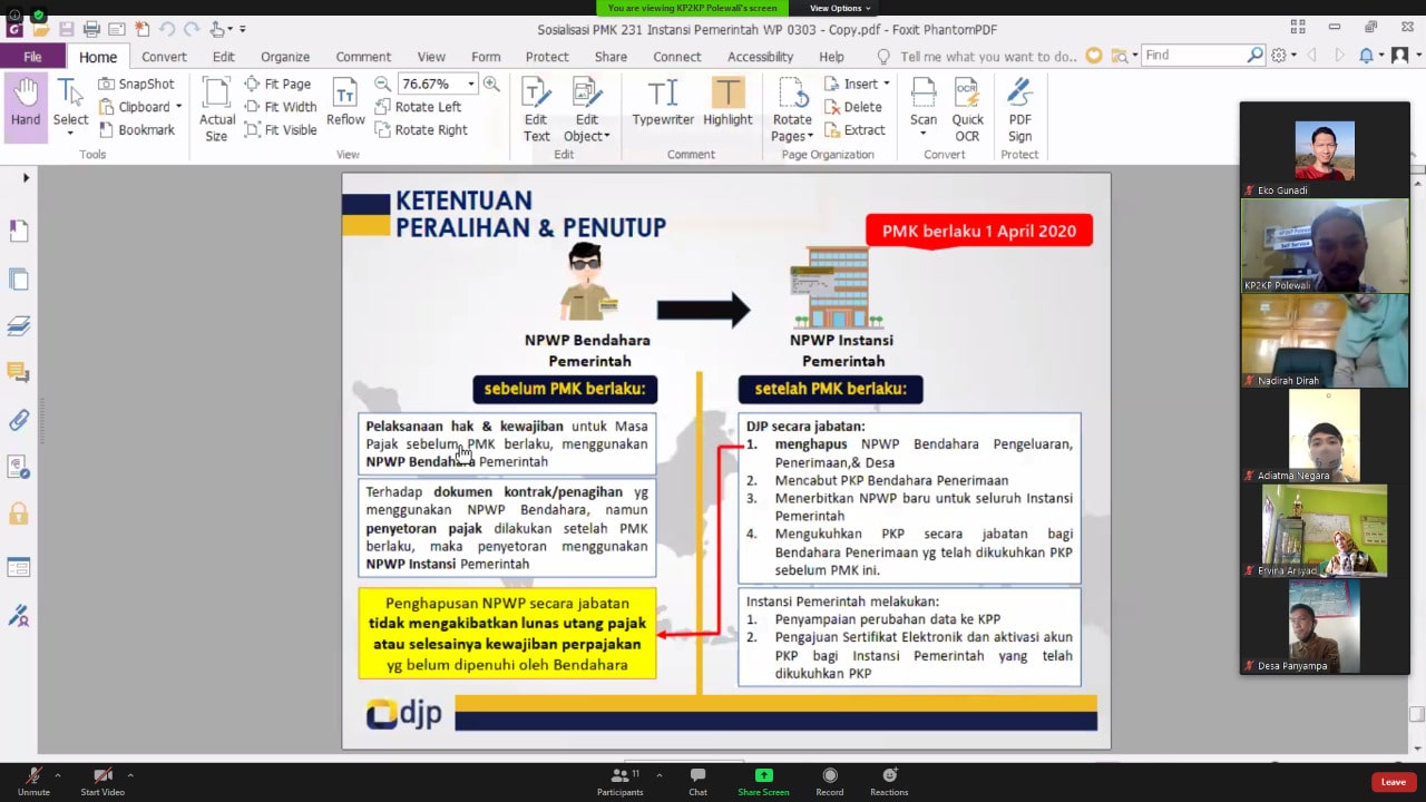 Pemberian materi dilakukan oleh salah satu pegawai KP2KP Polewali Muaffaq Salim. Sosialisasi tersebut diikuti oleh perwakilan dari beberapa Instansi Pemerintah yang berada di wilayah Kabupaten Polewali Mandar, dalam sosialisasi tersebut dijelaskan bahwa mulai tanggal 1 Juli 2020 sudah menggunakan NPWP Instansi Pemerintah dalam hal melakukan hak dan kewajiban perpajakannya. Apabila sebelum berlakunya aturan tersebut masih terdapat hak dan kewajiban yang belum terpenuhi, maka pemenuhannya masih menggunakan NPWP lamanya yaitu NPWP Bendahara.