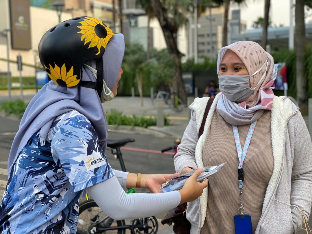 Komunitas pesepeda Garda Jaktim (Jakarta Timur) yang ada di Kantor Wilayah DJP Jakarta Timur mengadakan kegiatan kegiatan kampanye simpatik dengan gowes bersama sembari membagikan kit kenormalan baru di sekitar Tugu Tani hingga Bunderan HI, Jakarta (Jumat, 10/7).