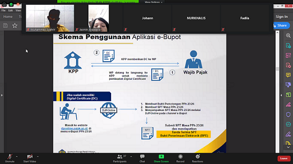 Seksi Ekstensifikasi dan Penyuluhan Kantor Pelayanan Pajak (KPP) Pratama Makassar Utara menyelenggarakan kegiatan Kelas Pajak Daring dengan tema 'Sosialisasi Aplikasi e-Bupot PPh Pasal 23/26' secara webinar melalui aplikasi Zoom Cloud Meeting di Makassar (Senin, 20/7). Kegiatan ini dimulai pada pukul 10.00 WITA dengan peserta wajib pajak badan dan bendaharawan KPP Pratama Makassar Utara.