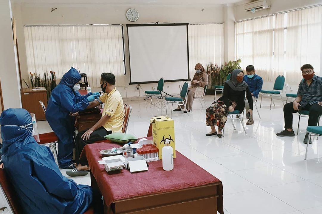 Bekerja sama dengan Parahita Diagnostic Center Bekasi, setiap pegawai wajib mengisi data diri dan menjawab beberapa kuesioner, kemudian mengisi daftar hadir dan antre di kursi yang telah disediakan. Setelahnya, petugas akan mengecek suhu tubuh setiap pegawai dan dilakukan pengecekan saturasi oksigen menggunakan pulse oxymeter hingga kemudian dilakukan pengambilan darah. Terdapat enam petugas yang mengenakan Alat Pelindung Diri (APD) lengkap dari Parahita Diagnostic Center Bekasi.