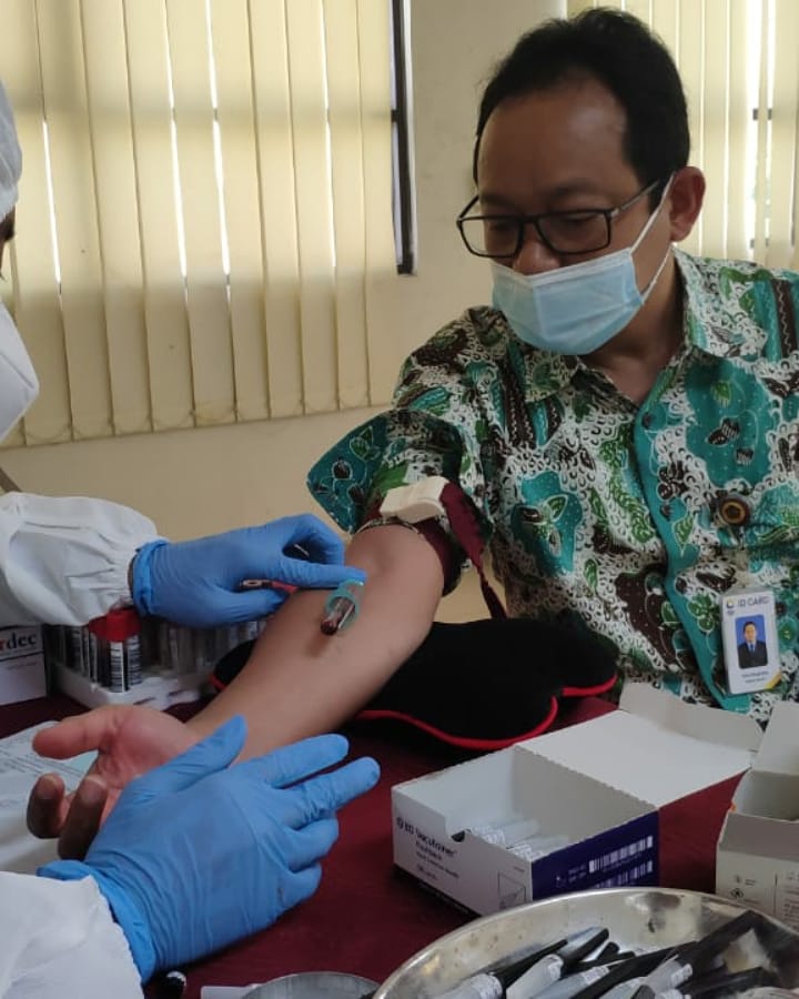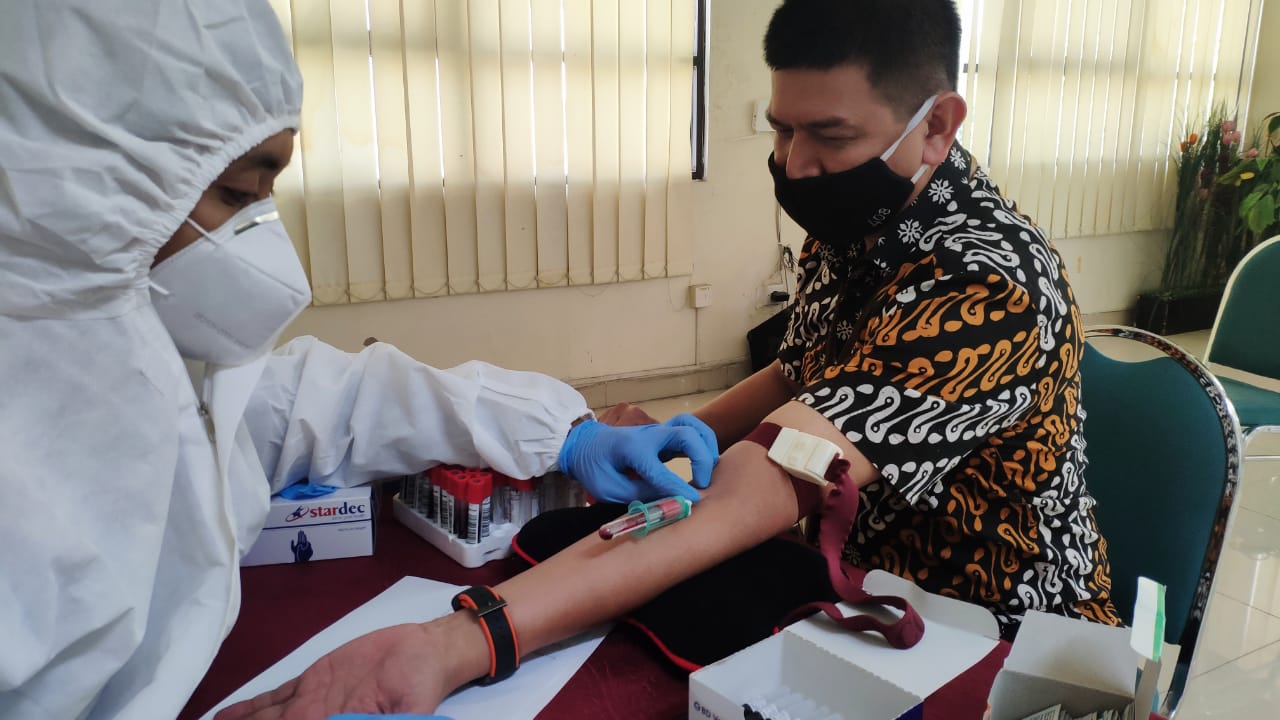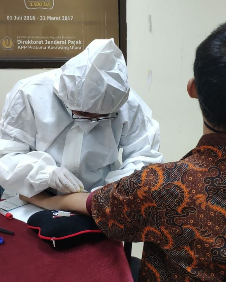 Bekerja sama dengan Parahita Diagnostic Center Bekasi, setiap pegawai wajib mengisi data diri dan menjawab beberapa kuesioner, kemudian mengisi daftar hadir dan antre di kursi yang telah disediakan. Setelahnya, petugas akan mengecek suhu tubuh setiap pegawai dan dilakukan pengecekan saturasi oksigen menggunakan pulse oxymeter hingga kemudian dilakukan pengambilan darah. Terdapat lima petugas yang mengenakan Alat Pelindung Diri (APD) lengkap dari Parahita Diagnostic Center Bekasi.