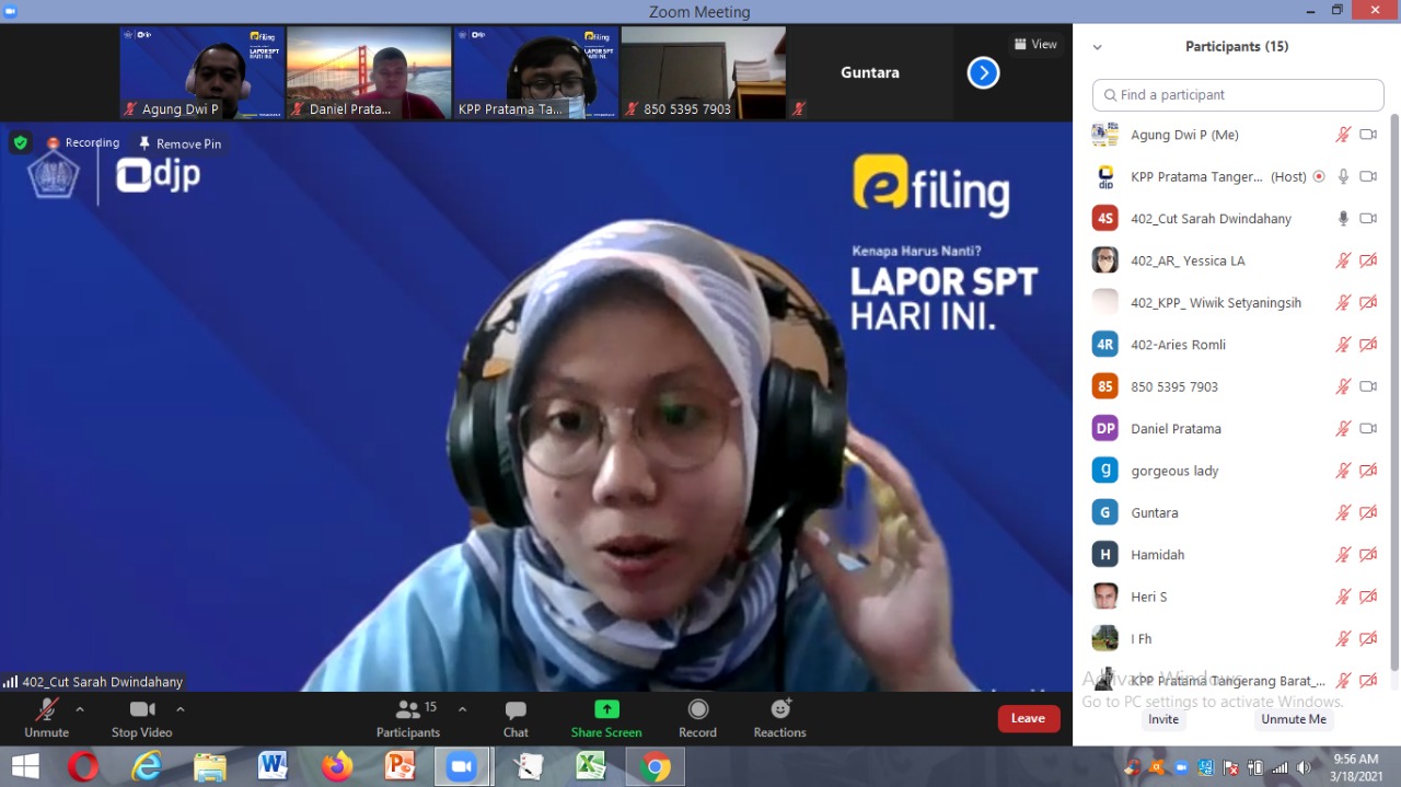 Kantor Pelayanan Pajak (KPP) Pratama Tangerang Barat mengadakan kegiatan kelas pajak untuk Wajib Pajak Orang Pribadi Non Karyawan melalui Zoom Meeting di Tangerang (Kamis, 18/3). Pada kesempatan kali ini, yang bertindak sebagai pemateri adalah Account Representative Cut Sarah dan Account Representative Agung Dwi Pambudi.