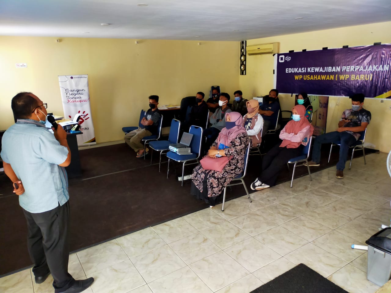 Dengan memperhatikan protokol kesehatan, peserta yang mengikuti kelas pajak wajib mengenakan masker dan telah dilakukan pengecekan suhu tubuh.