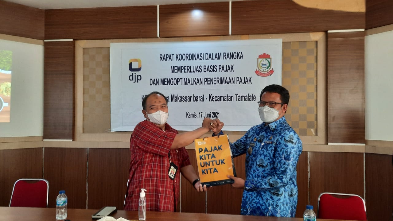 Kepala Kantor Pelayanan Pajak (KPP) Pratama Makassar Barat Eko Purbono bersama jajaran menghadiri kegiatan Rapat Koordinasi dalam rangka Memperluas Basis Pajak dan Mengoptimalkan Penerimaan Pajak bersama Camat Tamalate selaku perwakilan pemerintah daerah (Kamis, 17/6). Kegiatan ini dilangsungkan secara tatap muka dengan menerapkan protokol kesehatan di ruang aula kantor Kecamatan Tamalate, Kota Makassar.