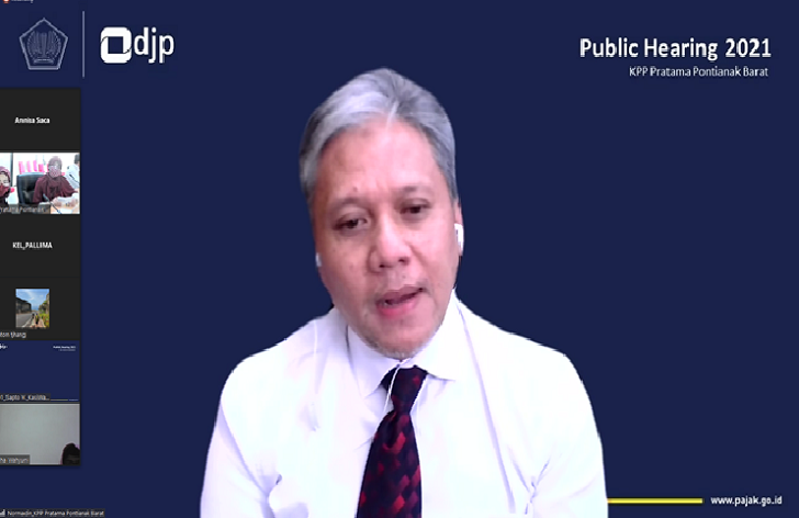 Kantor Pelayanan Pajak (KPP) Pratama Pontianak Barat menggelar kegiatan dengar pendapat umum (public hearing), Standar Pelayanan di ruang rapat KPP Pratama Pontianak Barat, Kota Pontianak (Senin, 19/7). Kegiatan ini dilaksanakan secara daring dan diikuti oleh tamu undangan yaitu orang pribadi, perwakilan badan, akademisi, dan perwakilan dari Kelurahan di Kecamatan Pontianak Barat dan Pontianak Kota.