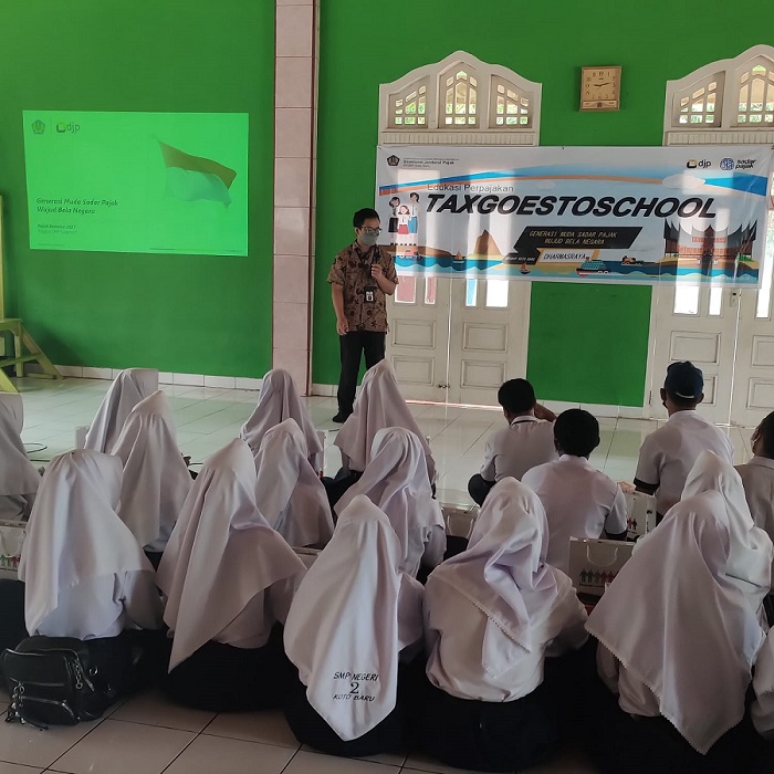 Kantor Pelayanan, Penyuluhan, dan Konsultasi Perpajakan (KP2KP) Kotabaru mengadakan Tax Goes to School (TGTS) di Masjid SMP Negeri 2 Koto Baru, Dharmasraya (Jumat, 17/9). TGTS ini diikuti oleh 33 orang siswa dan satu orang perwakilan guru dari SMP Negeri 2 Koto Baru.