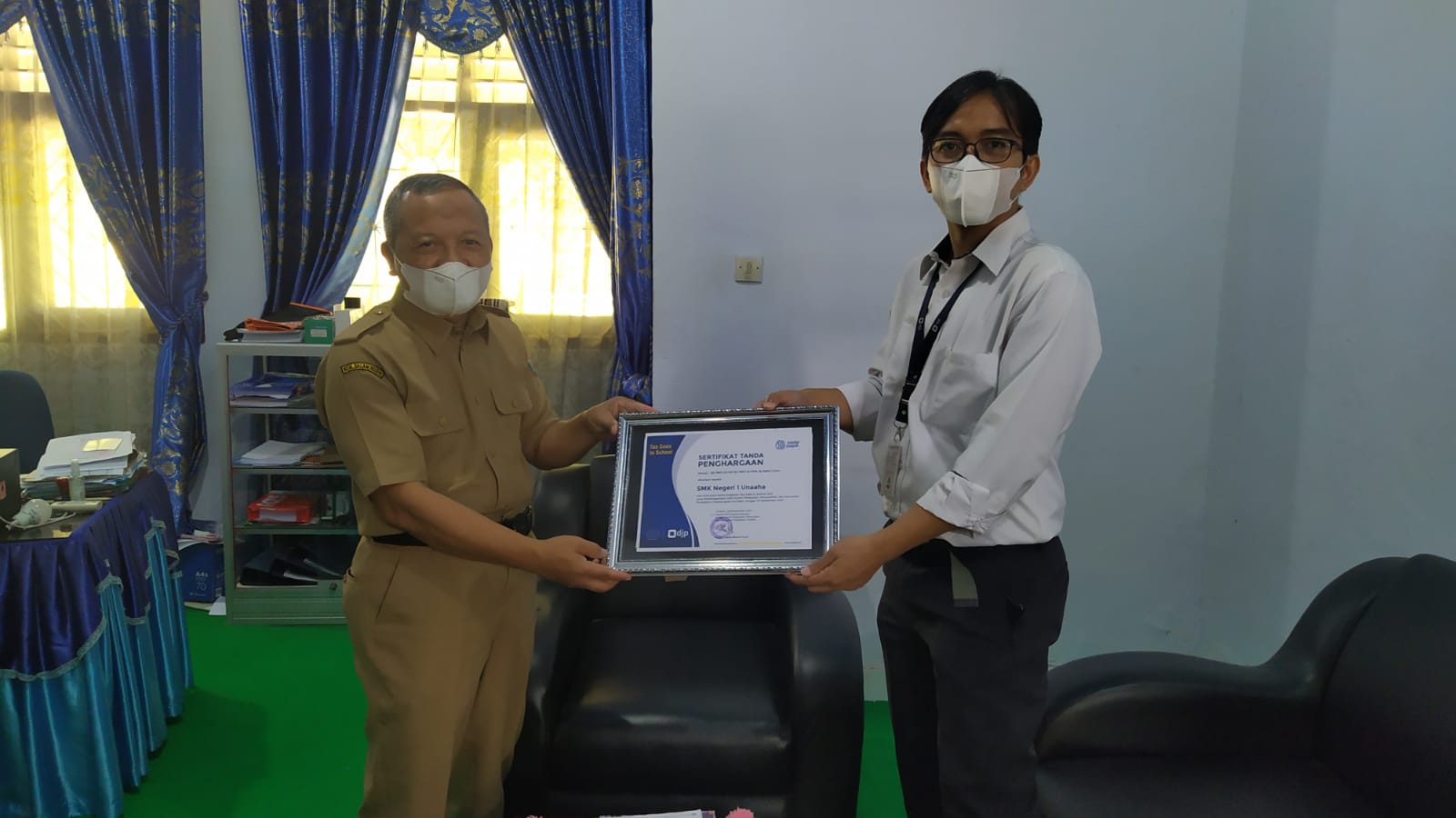 Kegiatan kali ini pada intinya adalah serah terima suvenir beserta sertifikat kegiatan TGTS tahun 2021 yang dilakukan oleh Yanuar selaku Kepala KP2KP Unaaha kepada pihak SMKN 1 Unaaha yang diwakili oleh Kartowiyono selaku Kepala SMKN 1 Unaaha dan Suwasni selaku Wakil Kepala SMK N 1 Unaaha bagian kurikulum. Sehubungan dengan pandemi Covid-19 yang masih melanda Indonesia, kegiatan kali ini dilaksanakan dengan tetap memperhatikan protokol kesehatan.