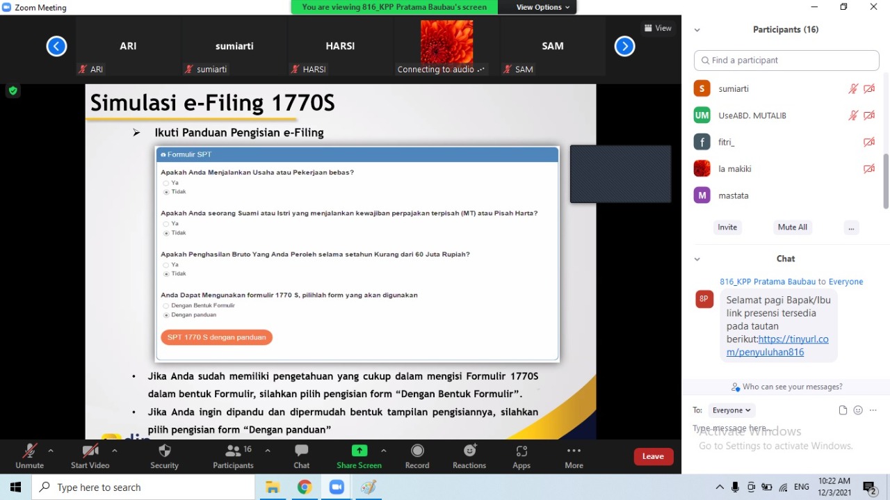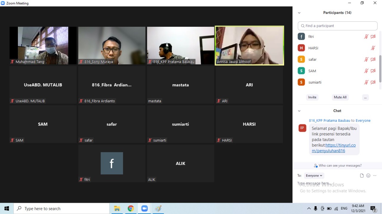 Kantor Pelayanan Pajak (KPP) Pratama Baubau memberikan edukasi pelaporan SPT Tahunan secara daring via Zoom Meeting kepada 20 Aparatur Sipil Negara (ASN) di lingkungan Pemerintah Daerah Kota Baubau (Jumat, 29/11). Tim penyuluh pajak KPP Pratama Baubau memandu jalannya acara langsung dari ruang kelas pajak KPP Pratama Baubau, Kota Baubau.