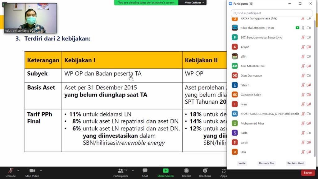 Tulus Dwi Atmanto didampingi beberapa anggota Tim Penyuluh Kantor Palayanan Pajak (KPP) Pratama Bantaeng lainnya, memaparkan materi UU HPP melalui Zoom Cloud Meeting. Materi yang dipaparkan mencakup Ketentuan Umum dan Tata Cara Perpajakan (KUP), Pajak Penghasilan (PPh), dan Pajak Pertambahan Nilai (PPN), serta Program Pengungkapan Sukarela (PPS) yang merupakan inovasi baru Direktorat Jenderal Pajak.