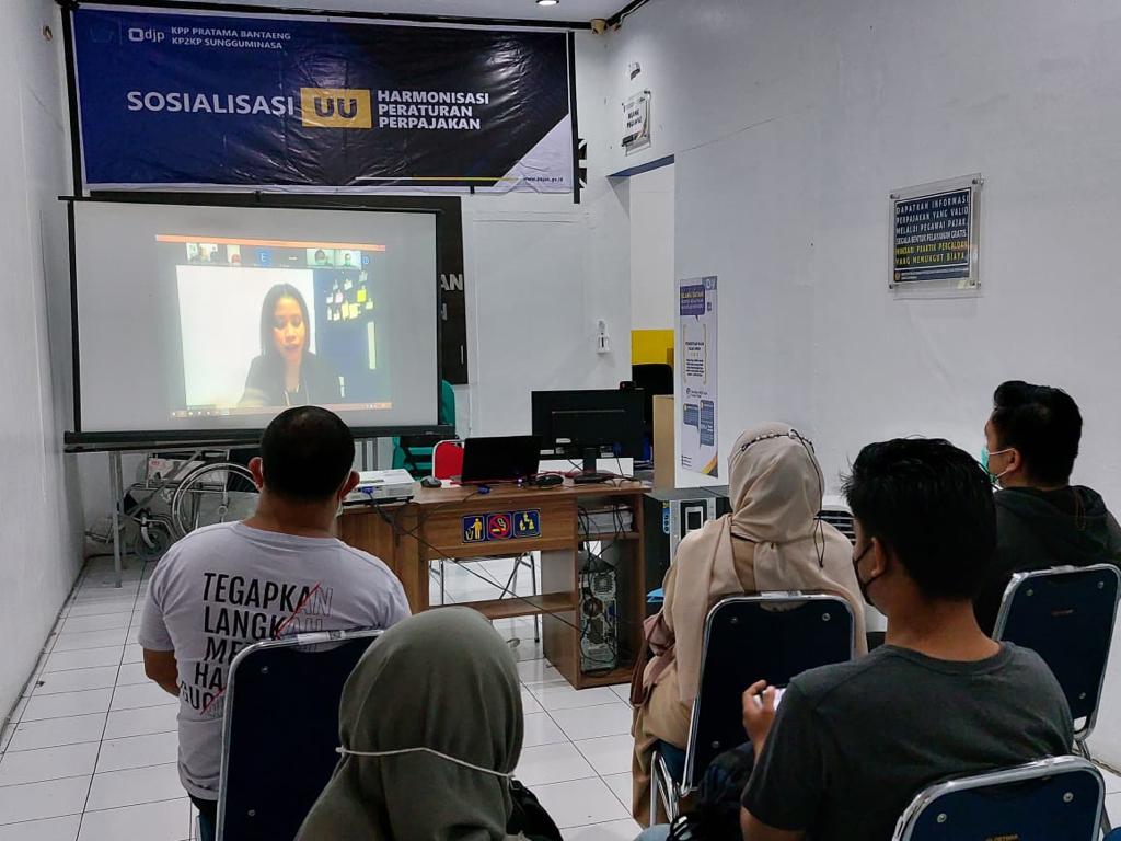 Kantor Pelayanan, Penyuluhan, dan Konsultasi Perpajakan (KP2KP) Sungguminasa menggelar sosialisasi Undang-Undang Harmonisasi Peraturan Perpajakan (UU HPP) secara Hybrid dengan menggandeng Tim Penyuluh Pajak di ruang KP2KP Sungguminasa (Rabu, 22/21). Kegiatan sosialisasi ini diselenggarakan secara luring dengan tetap menaati protokol kesehatan dan secara daring melalui aplikasi Zoom Cloud Meeting.