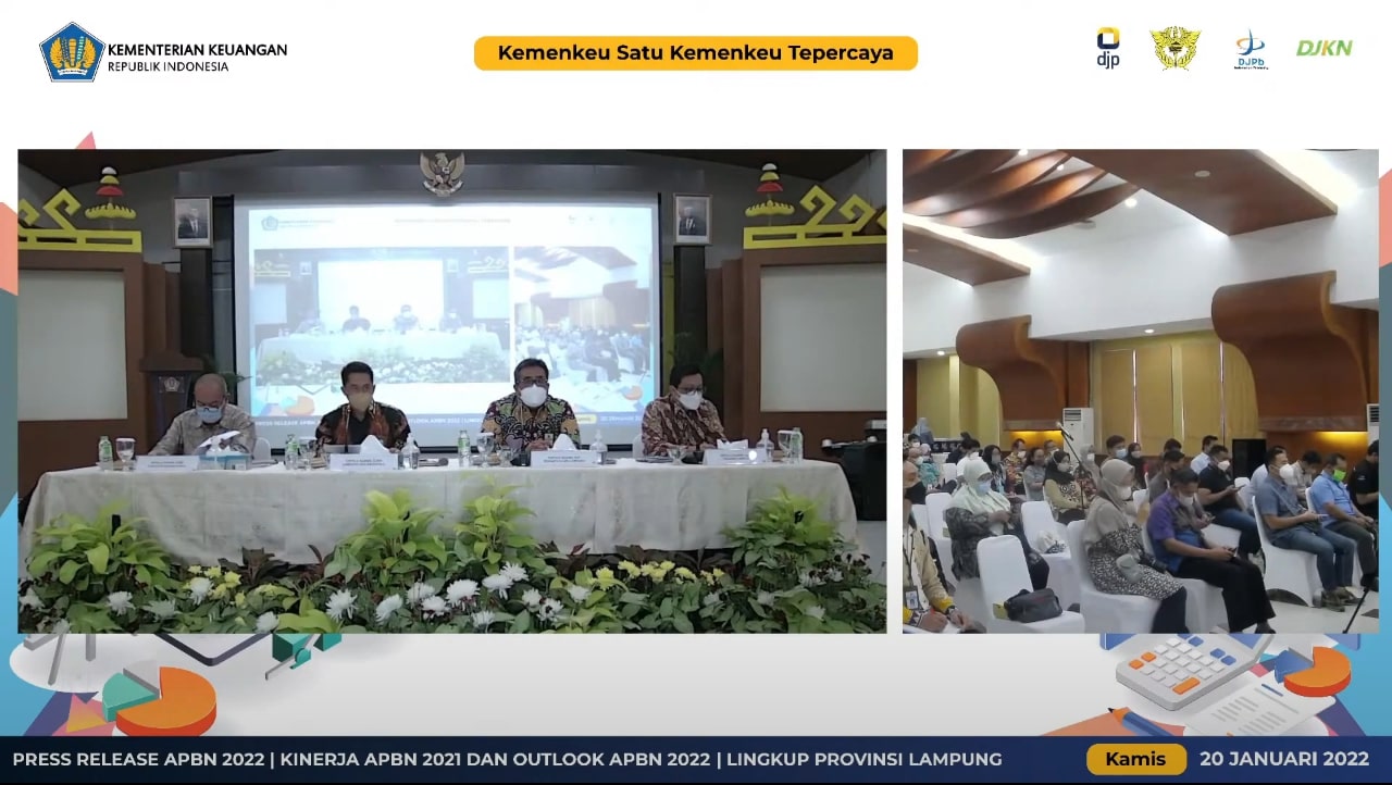Perwakilan Kementerian Keuangan Provinsi Lampung menyelenggarakan Press Release Kinerja APBN 2021 dan Outlook APBN 2022 di Aula Rafflesiger Kanwil DJP Bengkulu dan Lampung, Kota Bandar Lampung (Kamis, 20/1).