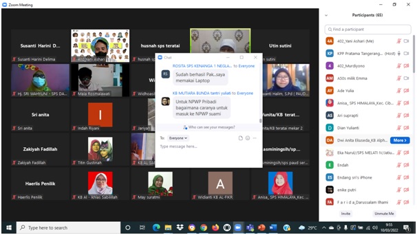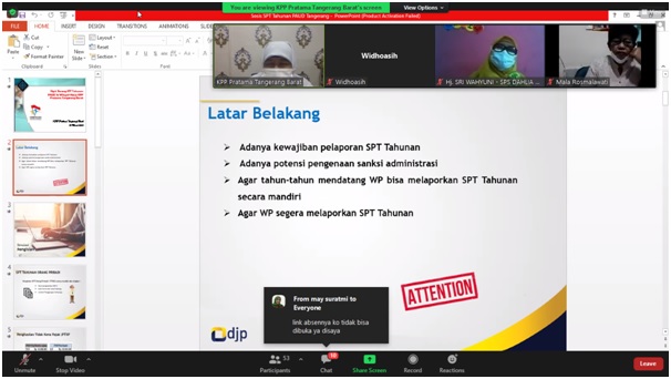 Kantor Pelayanan Pajak (KPP) Pratama Tangerang Barat mengadakan kelas pajak bagi Tenaga Pengajar dengan materi tata cara pengisian SPT Tahunan melalui aplikasi zoom cloud meeting dengan narasumber Fungsional Penyuluh Yani A dan Tri W dari KPP Pratama Tangerang Barat, Kota Tangerang (Kamis, 10/03).
