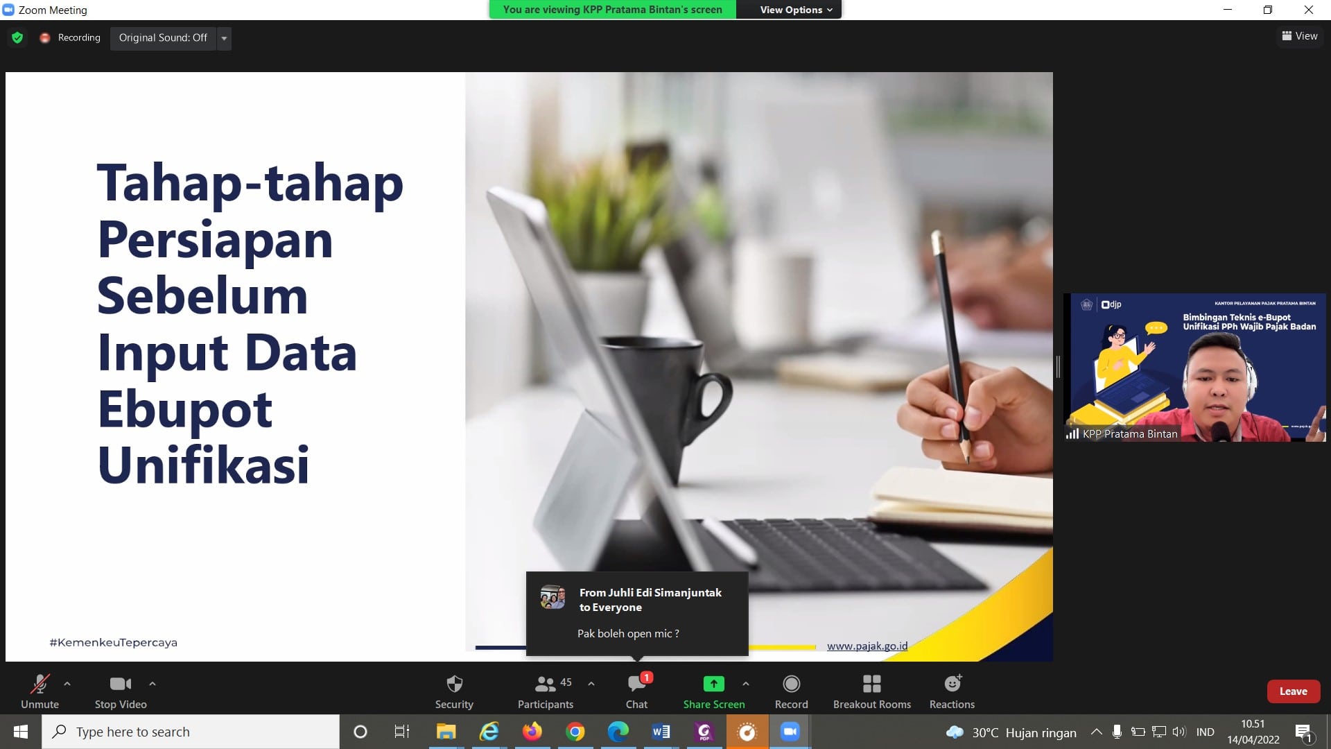 Kantor Pelayanan Pajak (KPP) Pratama Bintan mengadakan Bimbingan Teknis E-Bupot Unifikasi secara daring melalui Zoom Cloud Meeting di Bintan, Kepulauan Riau (Kamis, 14/4). Bimbingan Teknis ini diikuti oleh 45 Wajib Pajak (WP) Badan dengan narasumber Asisten Penyuluh Pajak di KPP Pratama Bintan Meiradi.