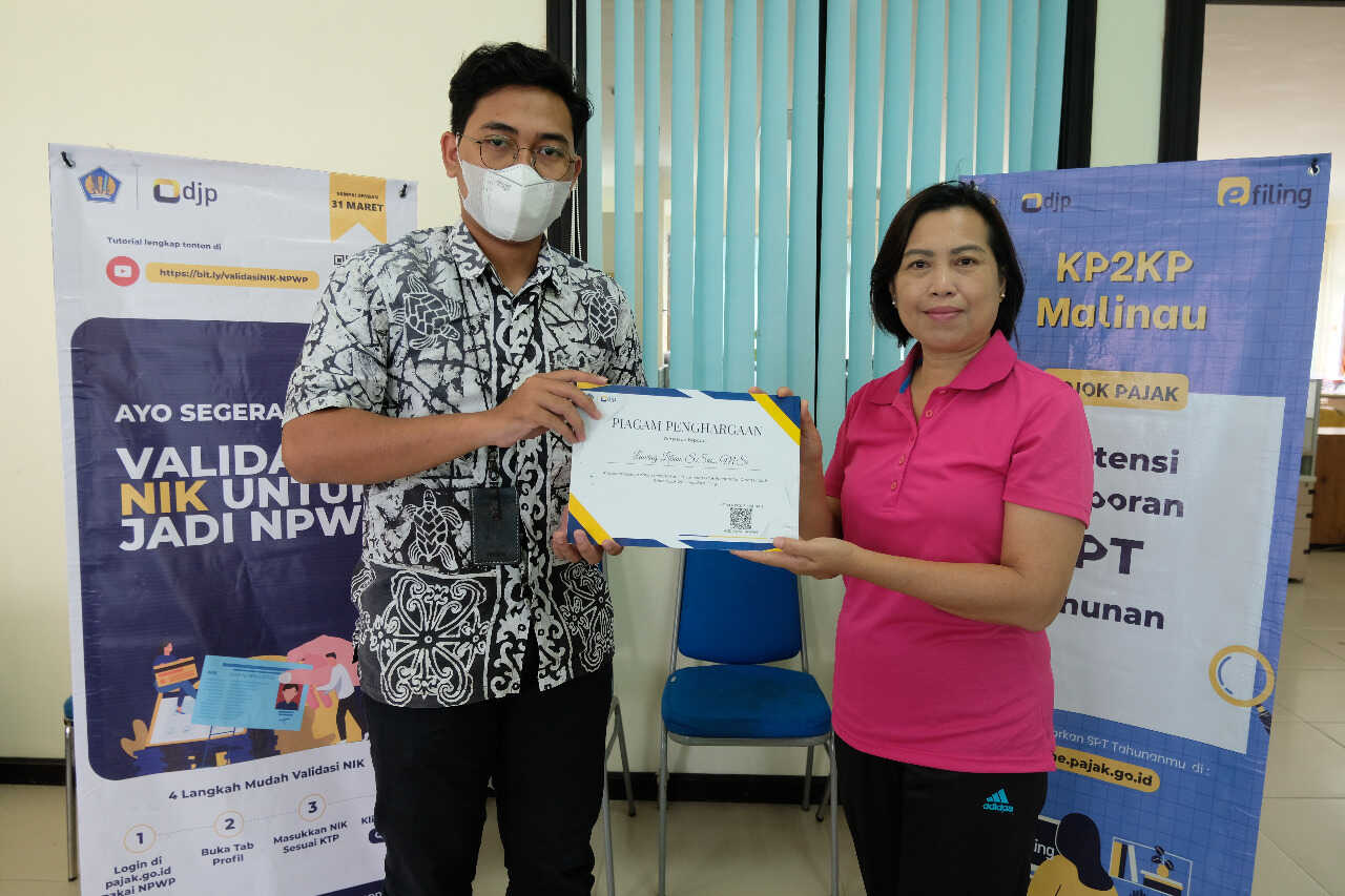 Kantor Pelayanan, Penyuluhan, dan Konsultasi Perpajakan (KP2KP) Malinau melakukan kegiatan asistensi pelaporan Surat Pemberitahuan (SPT) Tahunan melalui e-Filing sekaligus melakukan kegiatan pemadanan NIK-NPWP di Dinas Pemberdayaan Perempuan Perlindungan Anak dan Sosial (DPPPAS) Kabupaten Malinau, Kab. Malinau (Jumat, 27/1).