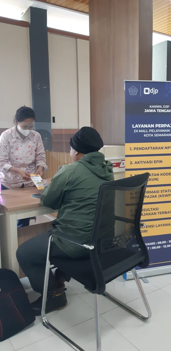 Bagus, salah satu pengunjung Mal Pelayanan Publik menyambangi beberapa instansi termasuk loket KPP Pratama Semarang. Bagus bertemu dengan petugas dari KPP Pratama Semarang Timur Angelina Ave Gratia dan Nurul Mustiyani. Ia mengajukan permohonan ulang Electronic Filing Identification Number (EFIN) dan melaporkan Surat Pemberitahuan (SPT) Tahunan tahun pajak 2022.