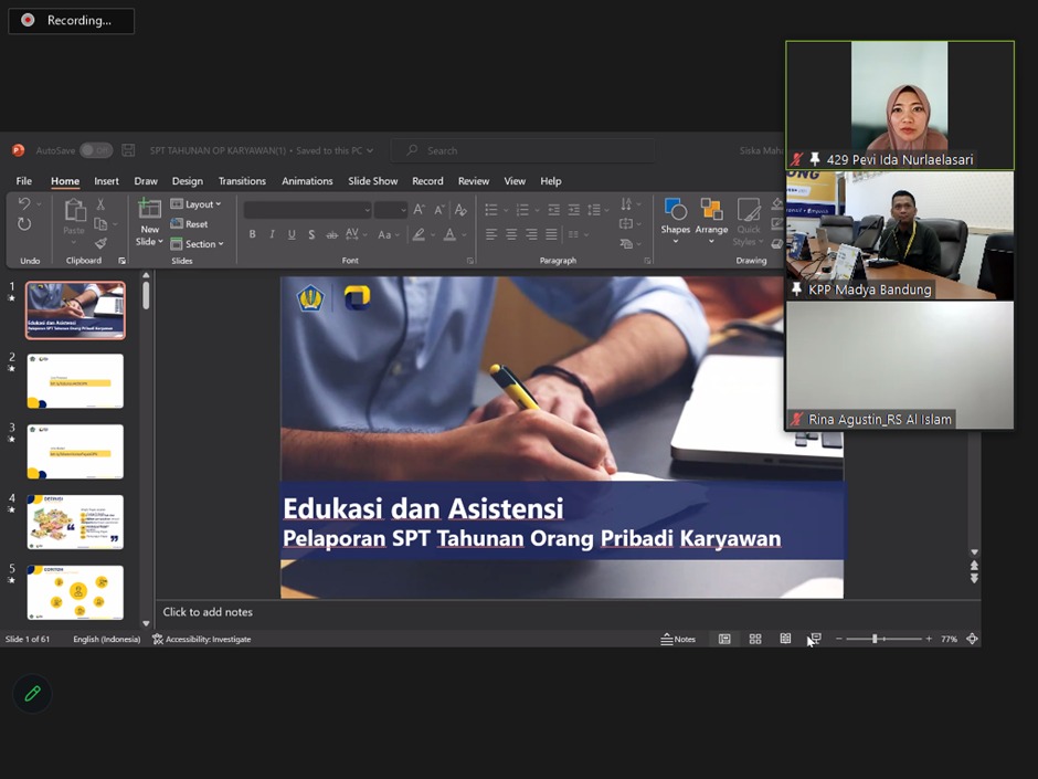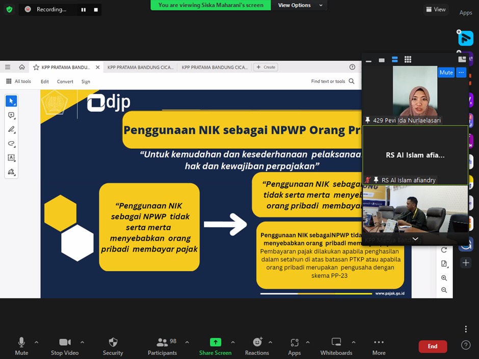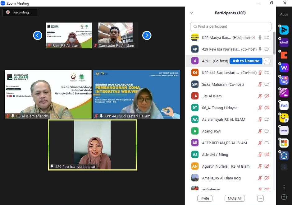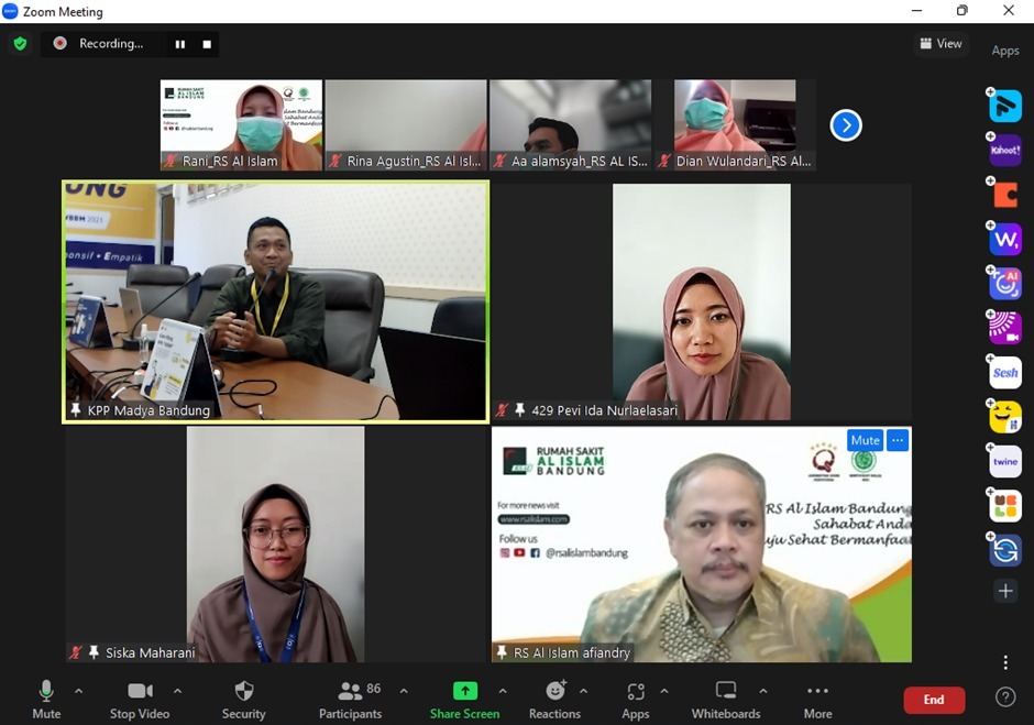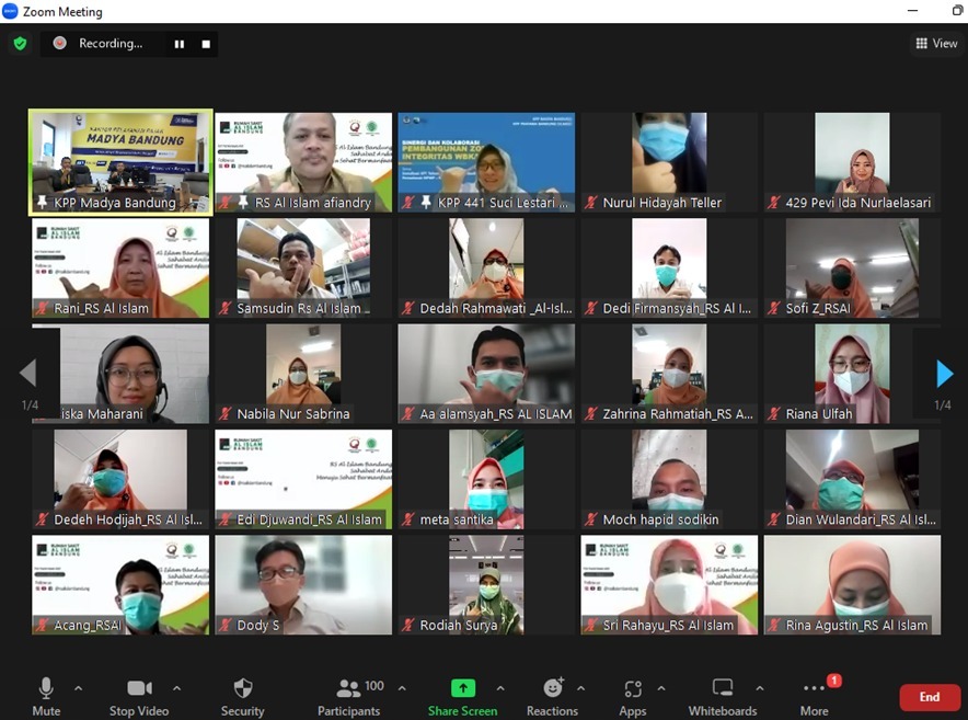 Untuk kedua kalinya, Kantor Pelayanan Pajak (KPP) Madya Bandung berkolaborasi kembali dengan KPP Pratama Bandung Cicadas menggelar acara Sosialisasi Tata Cara Pengisian SPT Tahunan Orang Pribadi dan Pemadanan NIK-NPWP bagi karyawan secara daring melalui aplikasi Zoom Meeting, di Kota Bandung (Kamis, 30/3). Kali ini kegiatan sosialisasi ditujukan untuk karyawan dari Rumah Sakit Al-Islam.