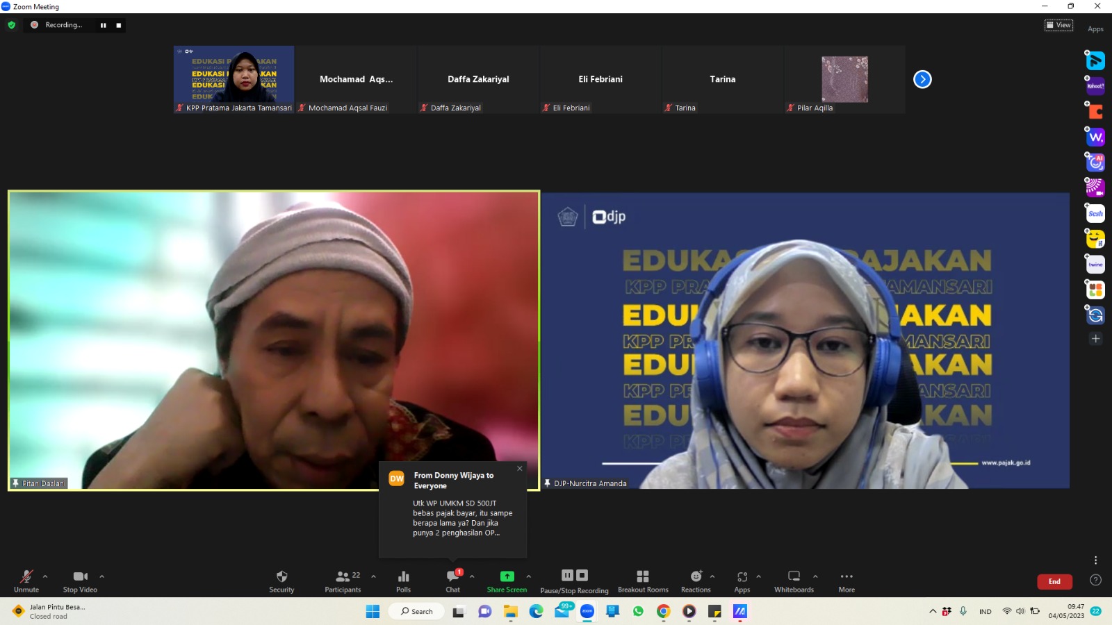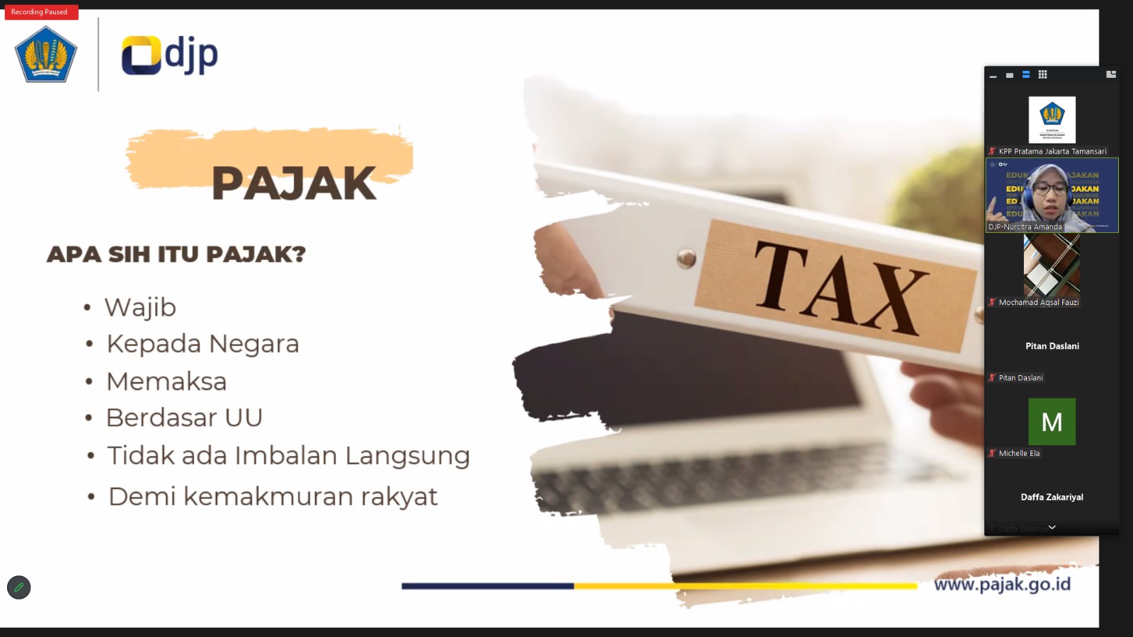 Kantor Pelayanan Pajak (KPP) Pratama Jakarta Tamansari mengadakan kegiatan sosialisasi kepada wajib pajak baru di Jakarta (Kamis, 4/5). Sosialisasi dilakukan secara daring melalui aplikasi Zoom Meeting.