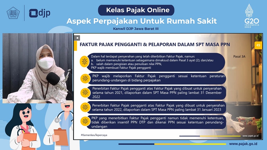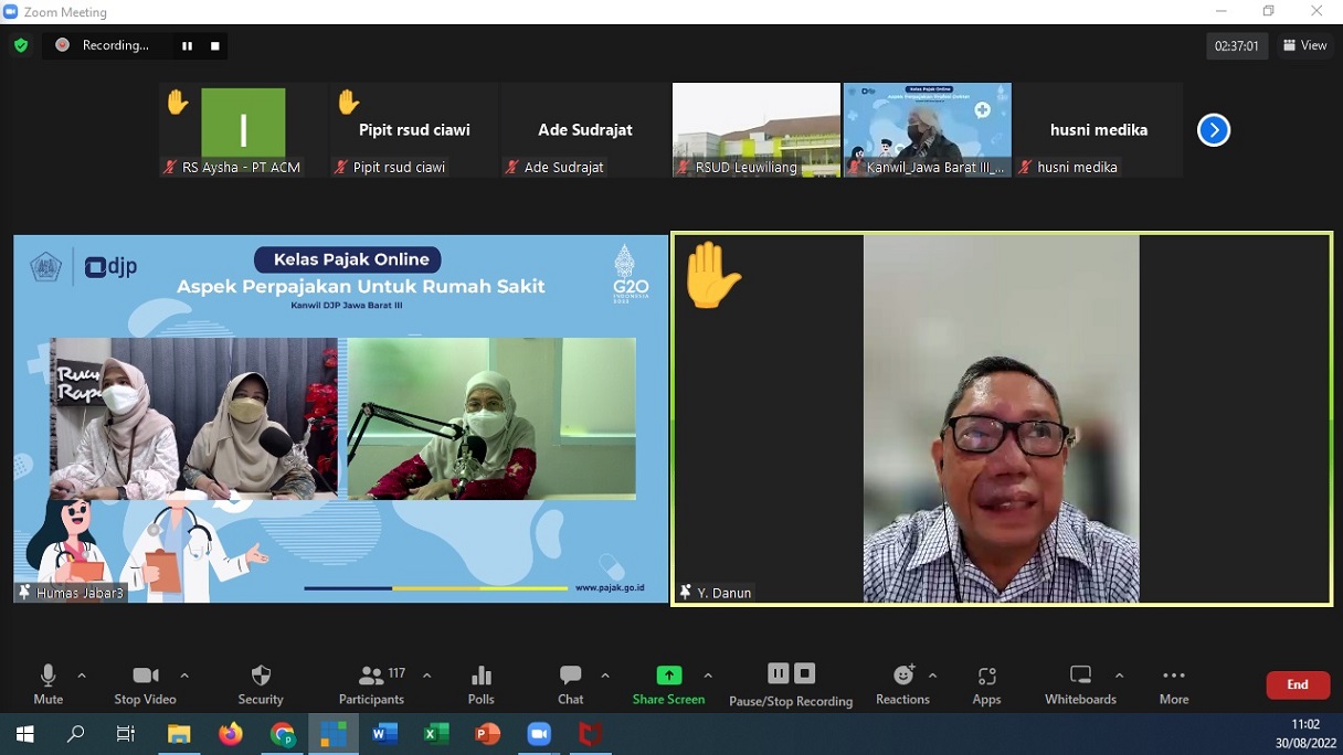 Kantor Wilayah (Kanwil) Direktorat Jenderal Pajak (DJP) Jawa Barat III melakukan sosialisasi "Aspek Perpajakan Bagi Rumah Sakit" kepada Rumah Sakit dan Klinik baik yang berada di wilayah Kota Bogor, Kota Bekasi, Kota Depok, dan Kabupaten Bogor secara daring dalam bentuk Kelas Pajak, Kota Bogor (30/8).