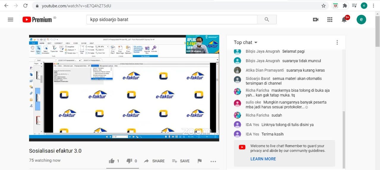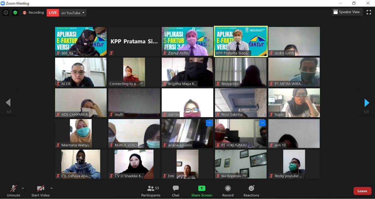 Sekitar 150 Wajib Pajak KPP Pratama Sidoarjo Barat mengikuti sosialisasi Aplikasi e-Faktur versi 3.0 melalui Zoom Meeting di Sidoarjo (Rabu, 23/9). Sosialisasi ini juga ditayangkan secara langsung dan diunggah ke kanal Youtube KPP Pratama Sidoarjo Barat sehingga wajib pajak yang tidak mengikuti webinar tetap dapat menonton video tersebut.