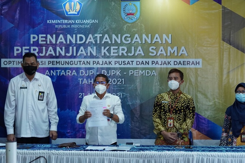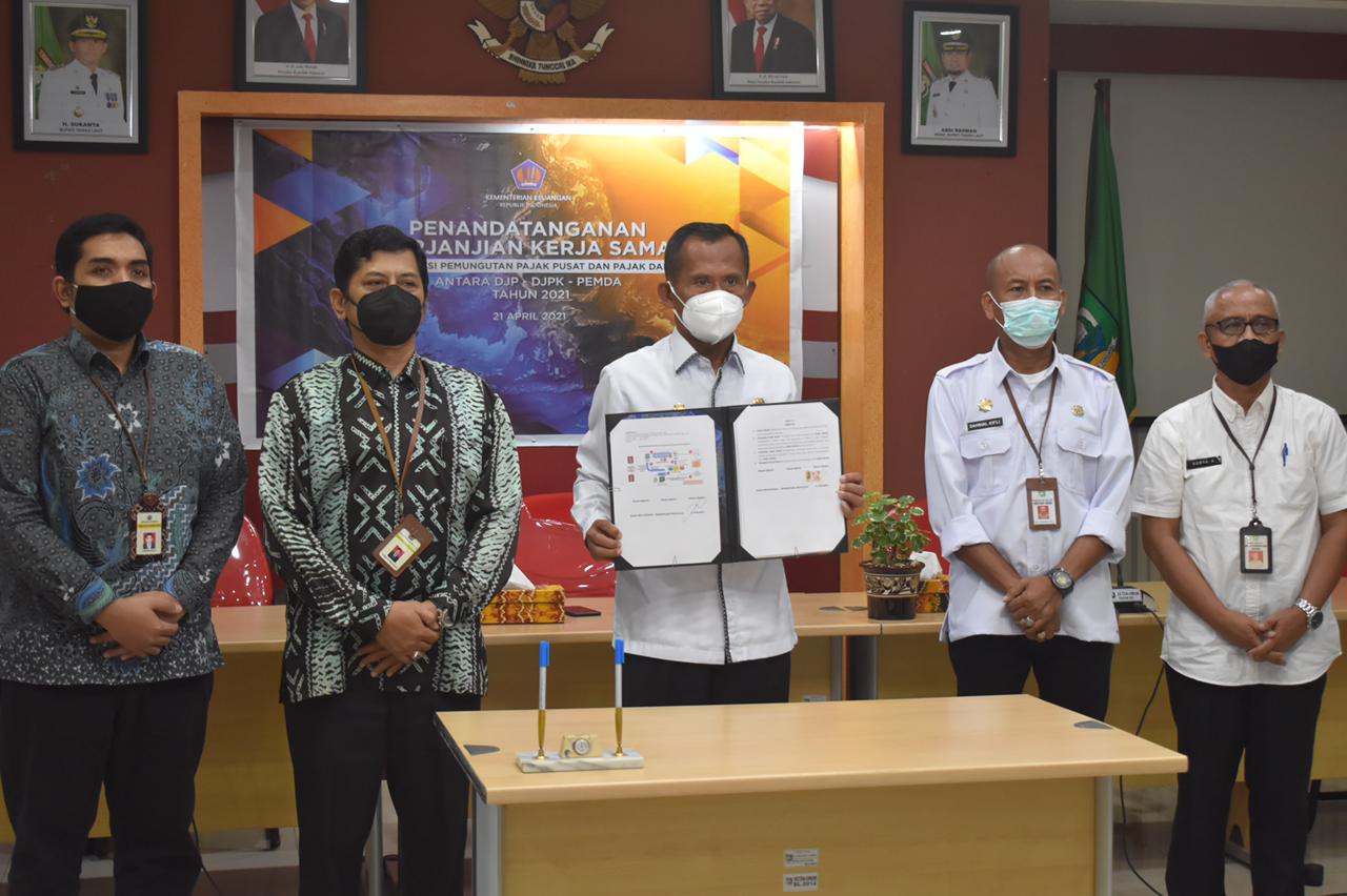Kepala Kantor Wilayah (Kanwil) Direktorat Jenderal Pajak (DJP) Kalimantan Selatan dan Tengah Tarmizi menyaksikan acara penandatanganan Perjanjian Kerja Sama (PKS) tentang Optimalisasi Pemungutan Pajak Pusat dan Pajak Daerah antara DJP, Bupati Katingan Sakariyas, Bupati Kotawaringin Timur Halikinnor, dan Direktorat Jenderal Perimbangan Keuangan di Aula Kantor Pelayanan Pajak (KPP) Pratama Sampit, Sampit (Rabu, 21/4).