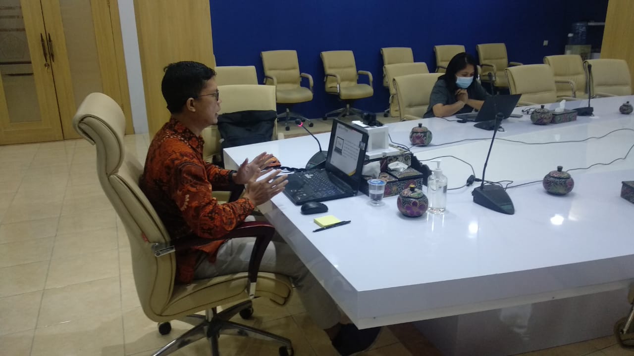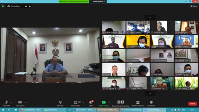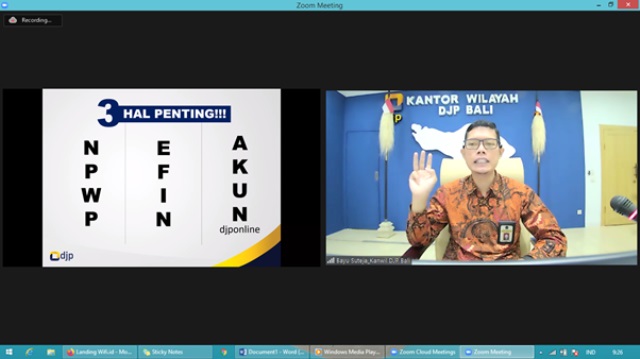 Dari ruang rapat besar Kanwil DJP Bali I Putu Adi Bayu Suteja yang merupakan Tim Penyuluh Kanwil DJP Bali menyampaikan materi. Narasumber lainnya adalah Fadli dari IKPI yang merupakan Relawan Pajak Non Mahasiswa.