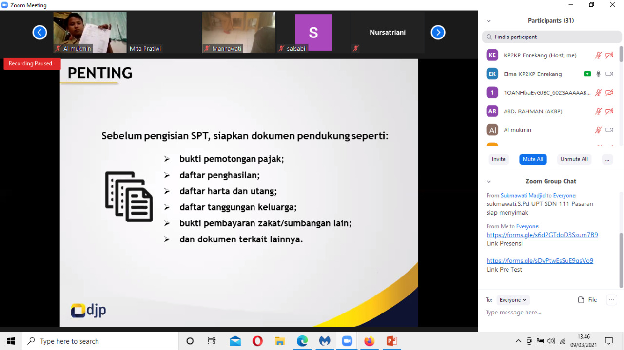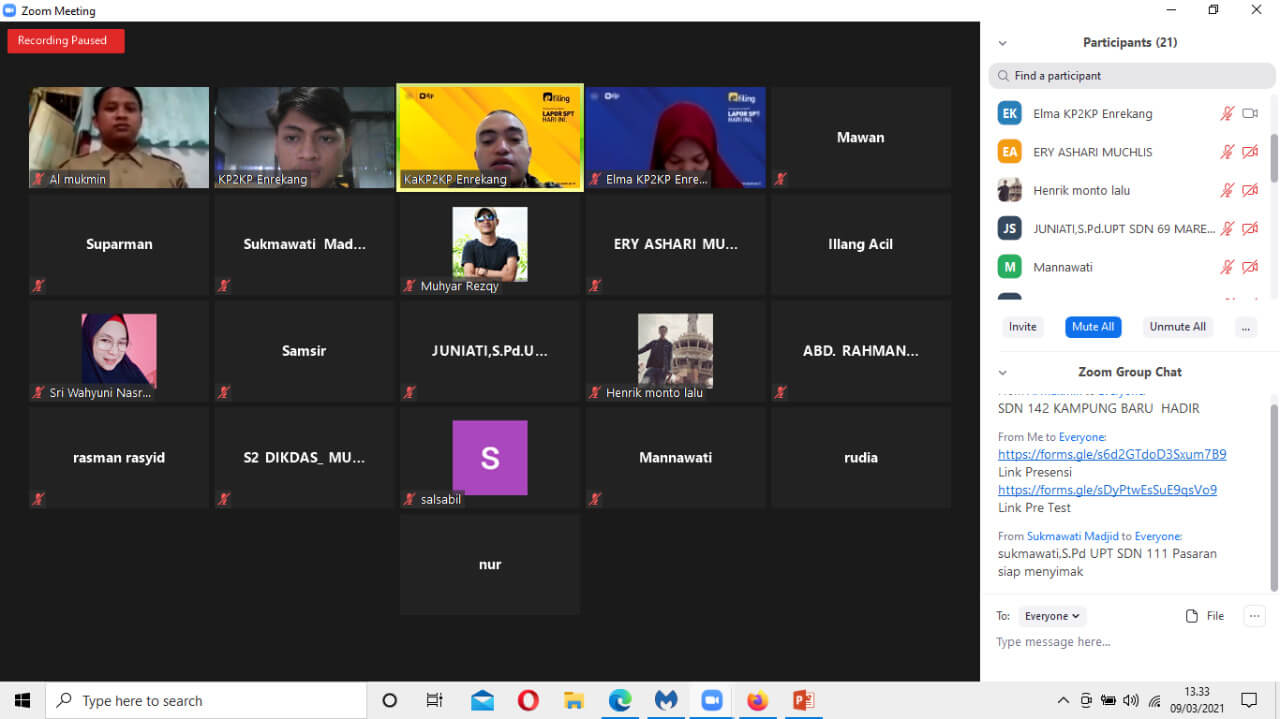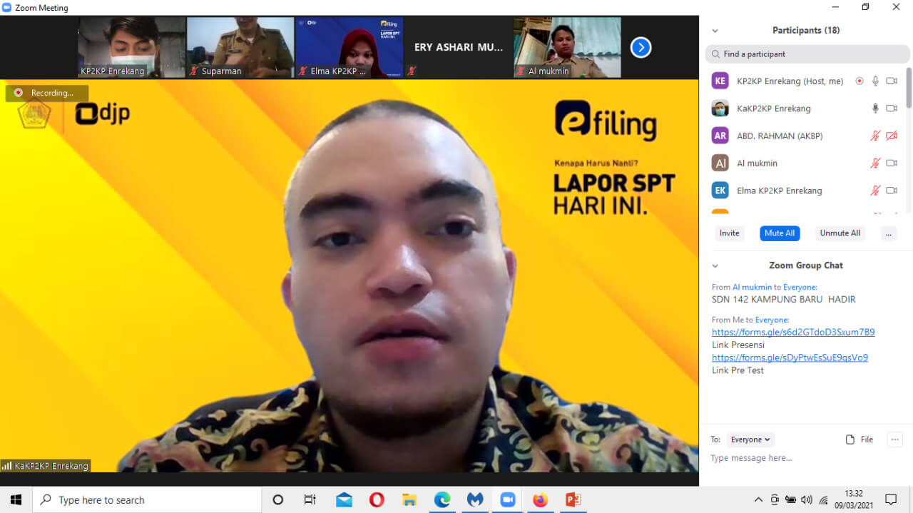 Kantor Pelayanan, Penyuluhan, dan Konsultasi Perpajakan (KP2KP) Enrekang mengadakan kegiatan penyuluhan perpajakan terkait tata cara pelaporan SPT Tahunan pada guru dan operator sekolah di wilayah Kabupaten Enrekang (Selasa, 9/3). Sejumlah 56 orang guru dan operator sekolah di wilayah Kabupaten Enrekang hadir sebagai peserta pada acara yang diadakan secara daring melalui media telekonferensi ini.