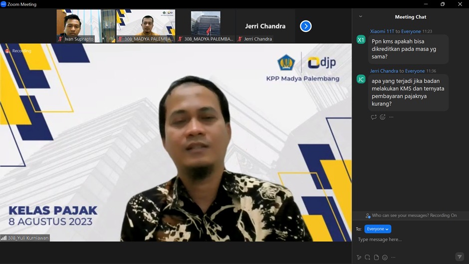 Kantor Pelayanan Pajak (KPP) Madya Palembang mengadakan kelas pajak intensif dengan materi mengenai Peraturan Menteri Keuangan Nomor PMK-61/PMK.03/2022 tentang Pajak Pertambahan Nilai atas Kegiatan Membangun Sendiri (KMS) secara daring di Palembang (Selasa, 8/8). Kelas pajak kali ini dibuka dan disampaikan langsung oleh Tim Penyuluh KPP Madya Palembang.