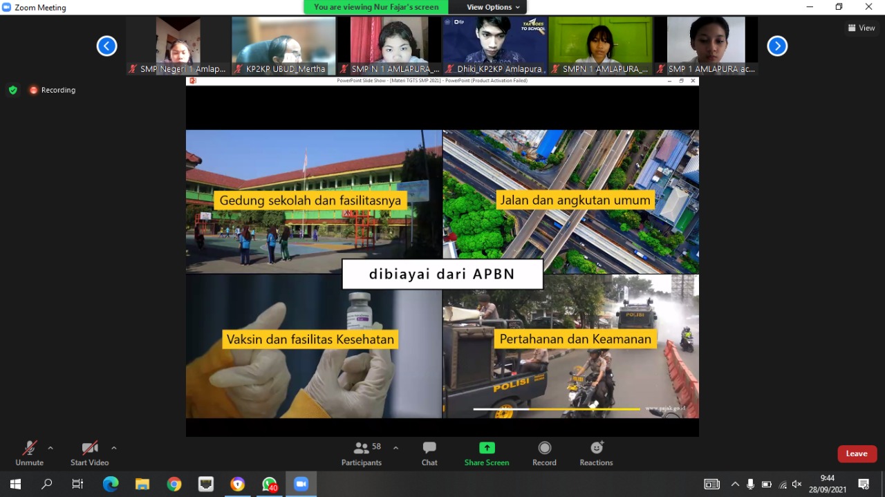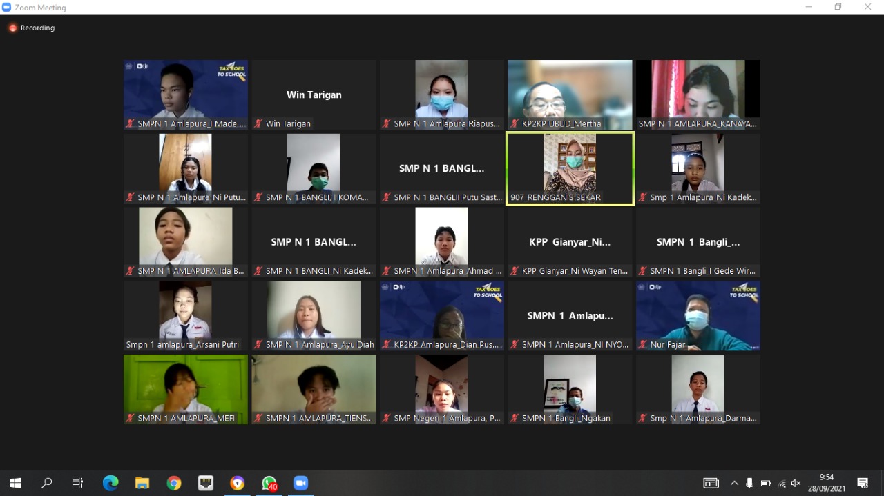 Kantor Pelayanan, Penyuluhan, dan Konsultasi Perpajakan (KP2KP) Ubud dan KP2KP Amlapura melaksanakan kegiatan Tax Goes To School (TGTS) secara daring di Gianyar, Bali (Selasa, 28/9). Kegiatan TGTS kali ini mengundang peserta dari Sekolah Menengah Pertama Negeri (SMPN) 1 Bangli dan SMPN 1 Semarapura.