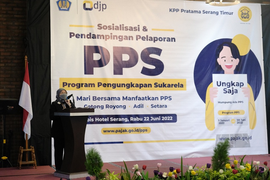 Kepala Kantor Wilayah (Kanwil) DJP Banten diwakili Kepala Bidang Penyuluhan Pelayanan dan Hubungan Masyarakat Kanwil DJP Banten Sahat Dame Situmorang menghadiri Sosialisasi dan Pendampingan Pelaporan Program Pengungkapan Sukarela (PPS) Kantor Pelayanan Pajak Pratama Serang Timur dengan tema Mari Bersama Manfaatkan PPS di Hotel Forbis, Kabupaten Serang (Rabu, 22/6).