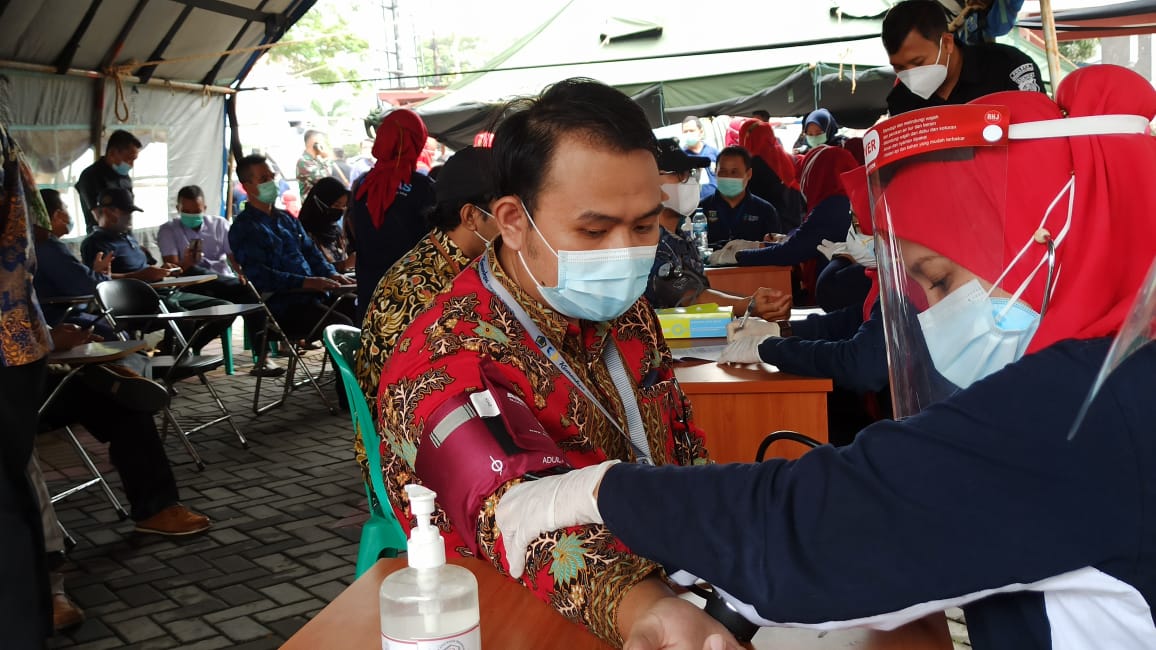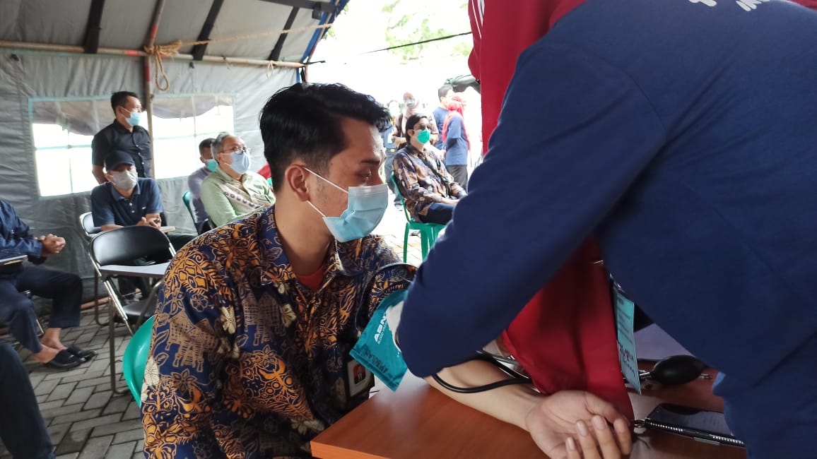 Sebelum mendapatkan vaksinasi, para pegawai terlebih dahulu melakukan pendaftaran dengan membawa fotokopi KTP yang diverifikasi dengan data peserta vaksinasi yang telah dikirimkan oleh masing-masing instansi. Setelah itu peserta diarahkan untuk melakukan cek tekanan darah dan kemudian diminta untuk antre menunggu giliran mendapatkan vaksinasi Covid-19.