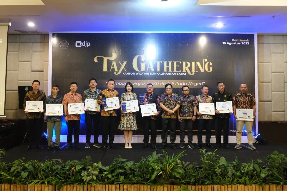 Kantor Wilayah Direktorat Jenderal Pajak (DJP) Kalimantan Barat memberikan penghargaan kepada Wajib Pajak dengan kontribusi pembayaran pajak terbesar tahun 2022 di lingkungan Kanwil DJP Kalimantan Barat pada kegiatan Tax Gathering 2023 dengan tema “Membayar Pajak Bukti Peduli Pada Negeri” di Hotel Mercure, Kota Pontianak (Selasa, 15/8).