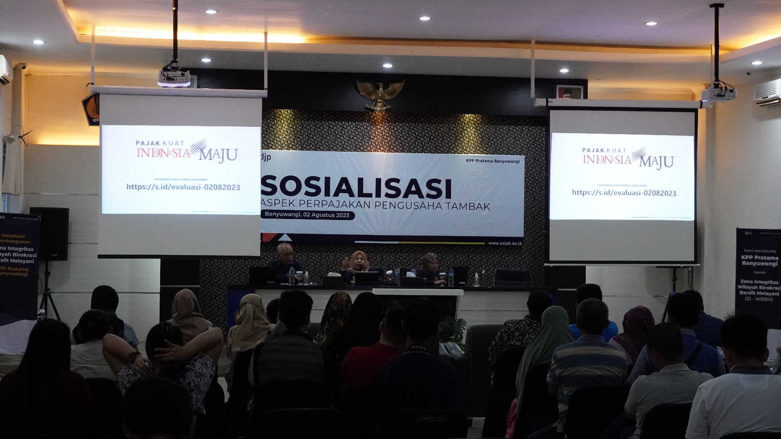 Penyuluh Pajak Kantor Wilayan Direktorat Jenderal Pajak Jawa Timur III (Kanwil DJP Jatim III) dan Kantor Pelayanan Pajak (KPP) Pratama Banyuwangi menyelenggarakan sosialisasi aspek perpajakan pengusaha tambak Ruang Aula KPP Banyuwangi, Jalan Adi Sucipto Nomor 27A, Banyuwangi, Jawa Timur (Rabu, 2/8).