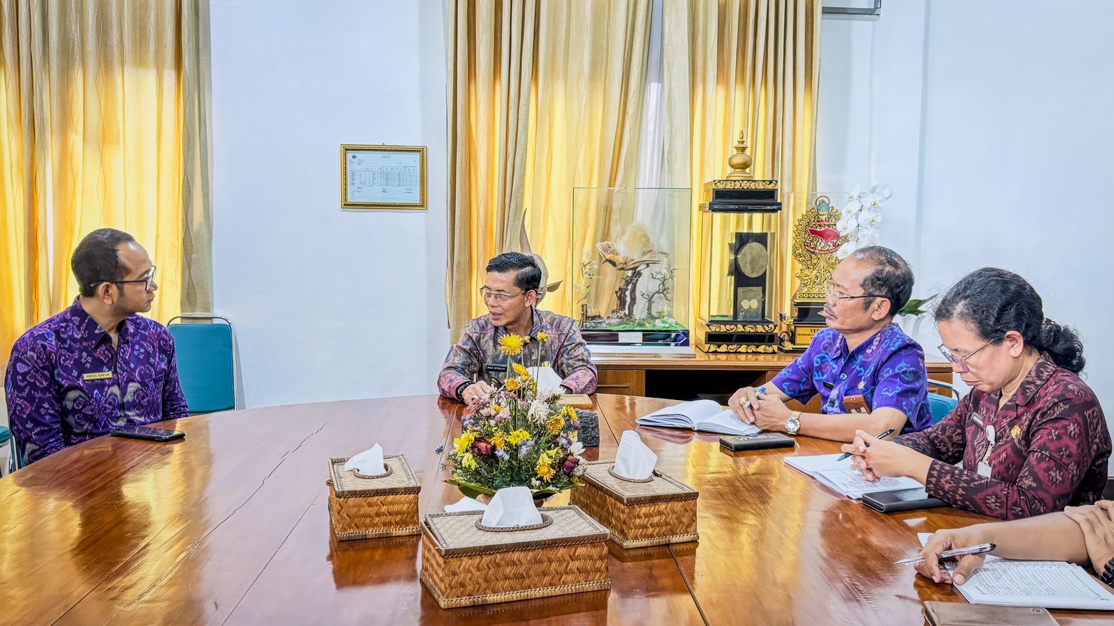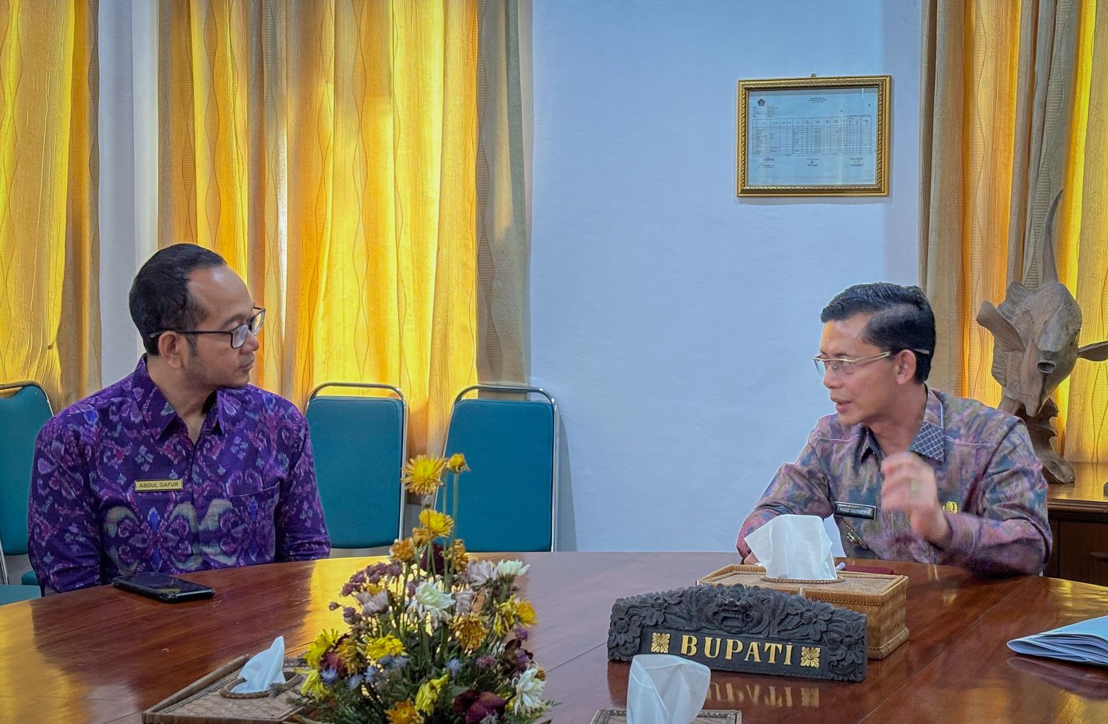 Bupati Klungkung, I Made Satria menerima Kepala Kantor Pelayanan Pajak (KPP) Pratama Gianyar, Abdul Gafur di ruang rapat gedung Kantor Bupati Klungkung (Selasa, 17/3). Kegiatan dilaksanakan sebagai bentuk komunikasi antar instansi demi peningkatan kinerja bersama.