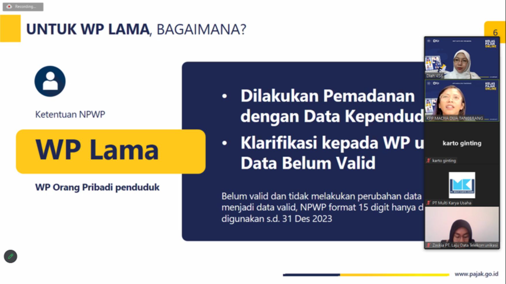 Kantor Pelayanan Pajak (KPP) Madya Dua Tangerang mengadakan kelas pajak dengan tema integrasi NIK menjadi NPWP dan sekaligus sosialisasi pelaporan SPT Tahunan Badan yang disampaikan oleh Fungsional Penyuluh Pajak yang diikuti oleh 87 peserta secara online langsung dari KPP Madya Dua Tangerang, Kota Tangerang (Selasa, 16/2).