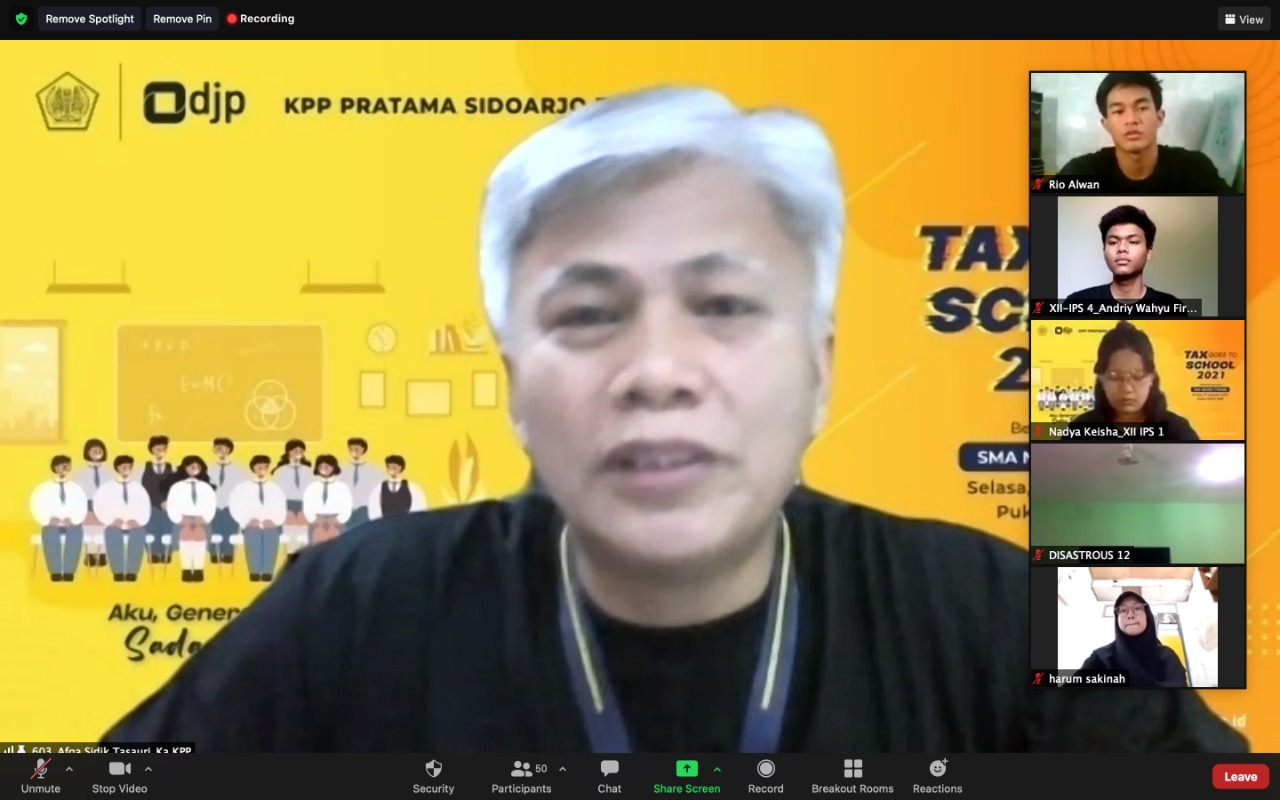 Sebanyak 30 siswa SMAN 1 Taman mengikuti acara Tax Goes To School (TGTS) yang diadakan oleh Kantor Pelayanan Pajak (KPP) Pratama Sidoarjo Barat. Acara dengan tema “Aku, Generasi Muda Sadar Pajak” tersebut diadakan secara daring melalui Zoom Cloud Meeting di Ruang Rapat KPP Pratama Sidoarjo Barat, Sidoarjo (Selasa, 31/8).